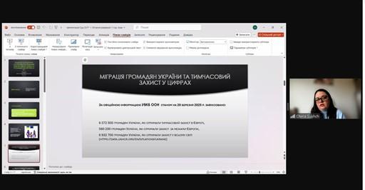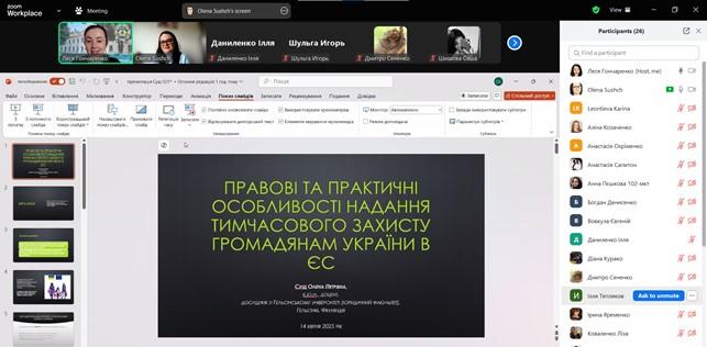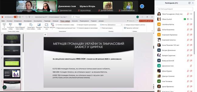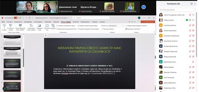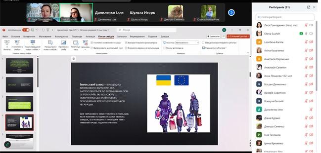 В ході заняття майбутні фахівці ознайомлені з особливостями тимчасового захисту громадян України в Європейському Союзі, роз`яснена різниця термінів «тимчасовий захист» та «біженство», проаналізовані характерні особливості механізму тимчасового захисту та його проблемні моменти. Тема заняття, зважаючи на її актуальність, була сприйнята студентами з неабиякою цікавістю. По завершенню викладення матеріалу, проведена дискусія та дані відповіді на питання здобувачів вищої освіти.