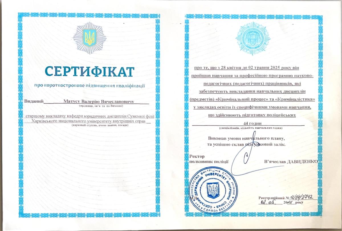 З 28 квітня по 2 травня 2025 року на базі Одеського державного університету внутрішніх справ старший викладач кафедри юридичних дисциплін Сумської філії ХНУВС Валерій Матус успішно пройшов навчання за професійною програмою курсів підвищення кваліфікації для науково-педагогічного та педагогічного складу, який забезпечує викладання дисциплін «Кримінальний процес» та «Криміналістика» у закладах вищої освіти зі специфічними умовами навчання.