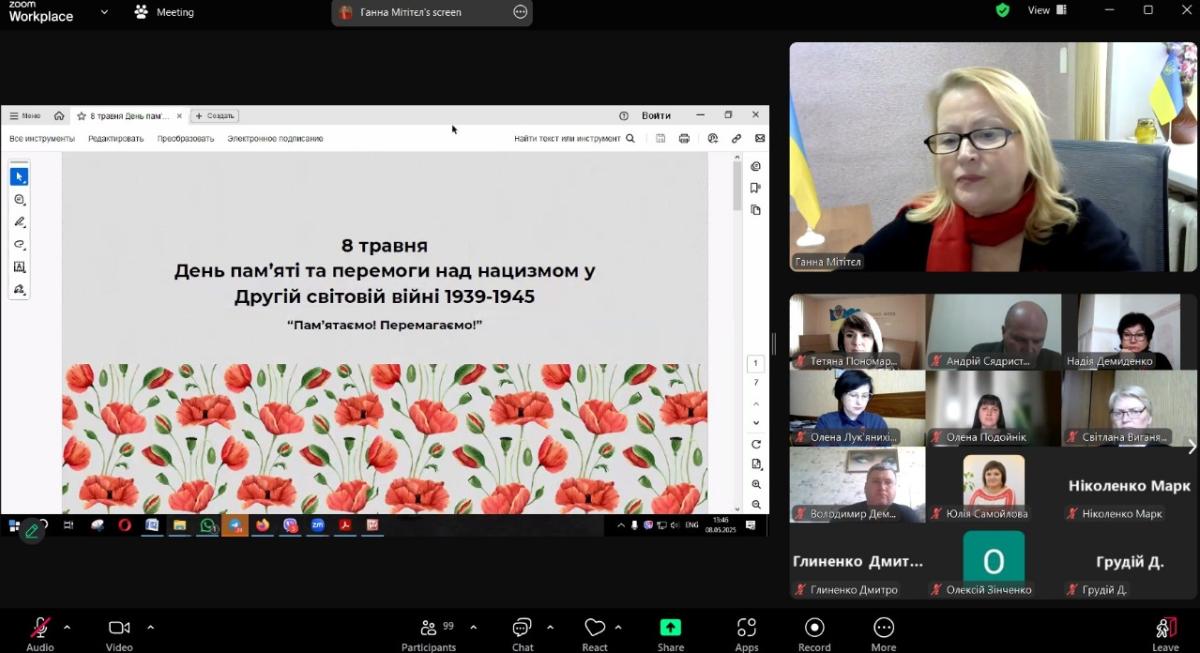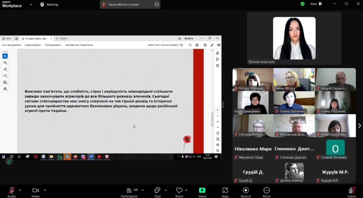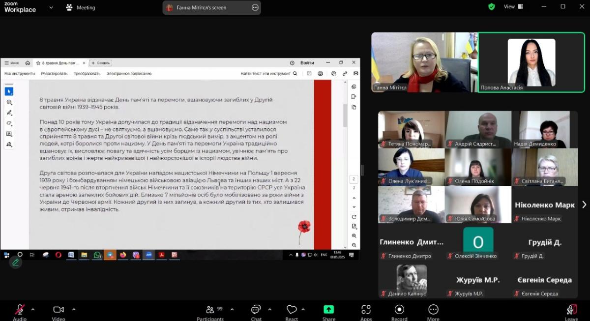 З метою формування національної свідомості, поваги до історії та героїчного минулого нашого народу, виховання почуття гордості за рідну країну у Сумській філії Харківського національного університету внутрішніх справ було проведено тематичний захід, присвячений Дню пам’яті та перемоги над нацизмом у Другій світовій війні 1939-1945 років, в якому взяли участь здобувачі освіти та куратори навчальних груп – Тетяна Пономаренко, Андрій Сядристий, Світлана Виганяйло, Володимир Дементов, Олена Лук’янихіна, Надія Демиденко, Юлія Самойлова та заступник начальника курсу, капітан поліції Олена Подойник.