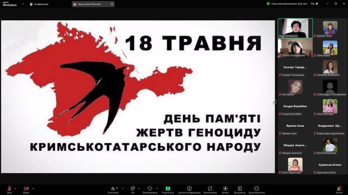 Для здобувачів вищої освіти 3 курсу спеціальності Право, 1 та 3 курсів спеціальності Правоохоронна діяльність була проведена історична година-спомин «Дорогами болю», присвячена депортації кримськотатарського населення з півострова Крим у травні 1944 року (куратори Демиденко Н.М., Самойлова Ю.І., Пономаренко Т.О.).