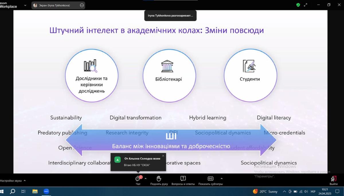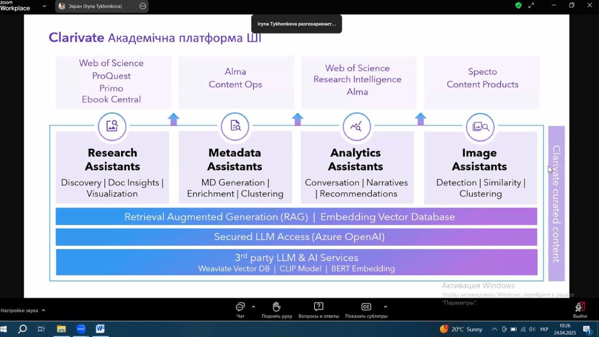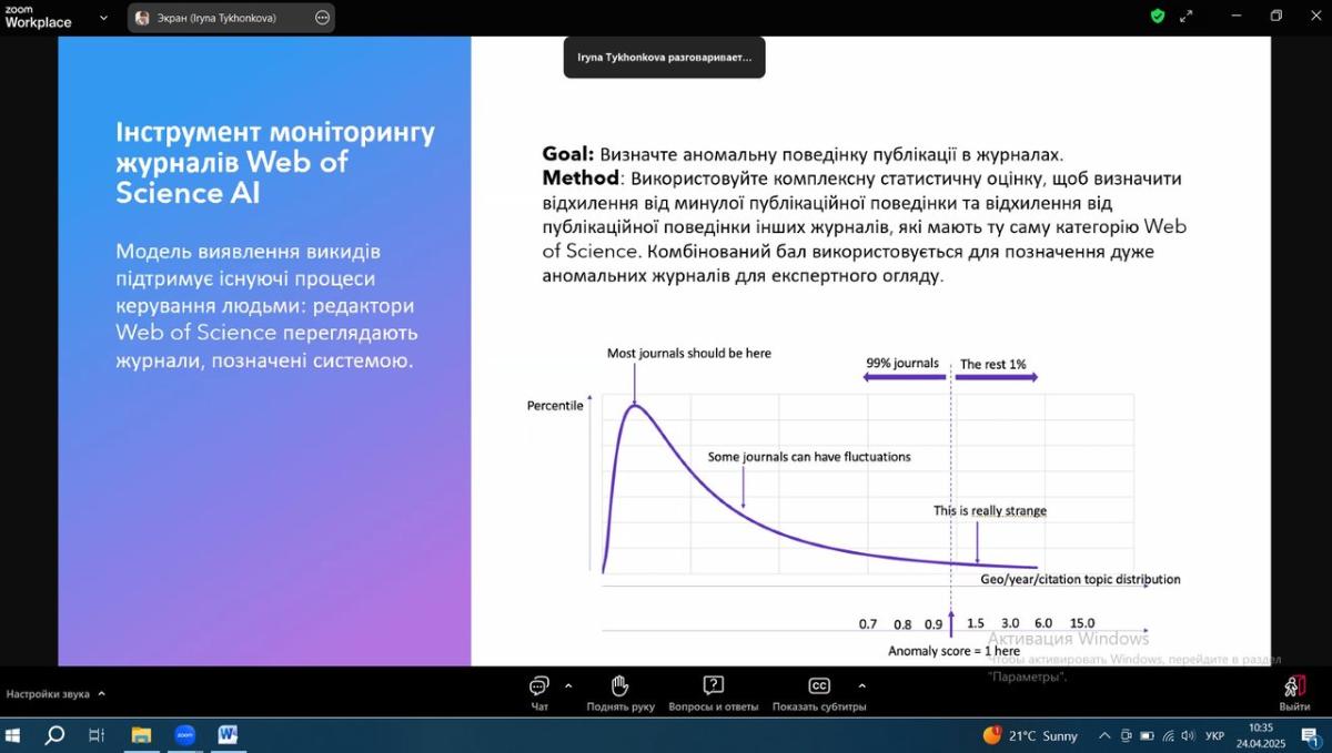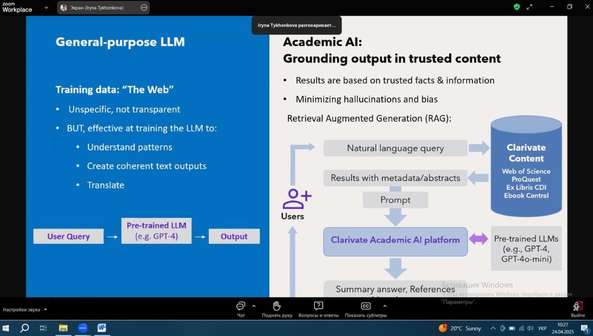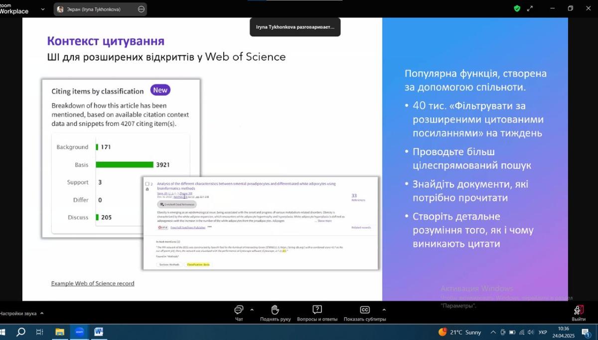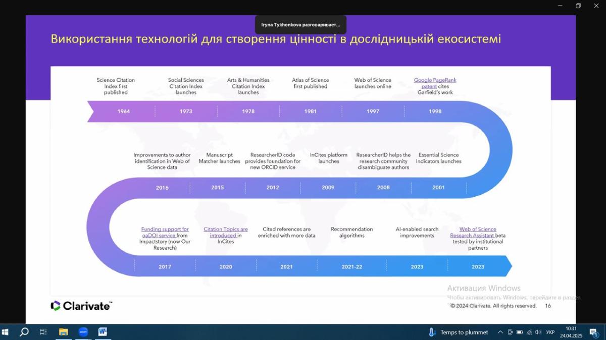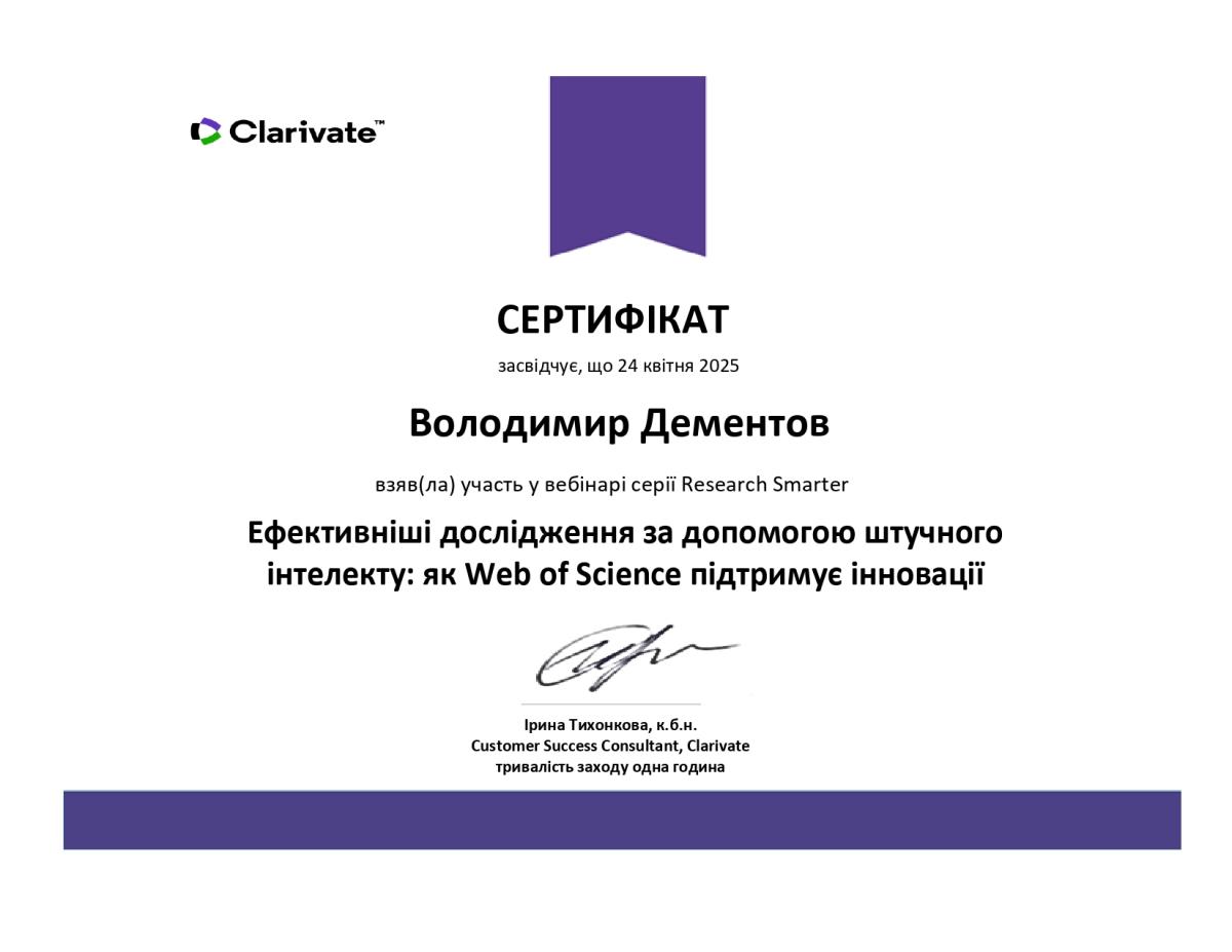Тези навчання: штучний інтелект трансформує академічні дослідження, викладання та навчання. Clarivate гарантує можливість безпечно і відповідально орієнтуватися в цьому новому ландшафті, забезпечуючи при цьому досконалість досліджень. В рамках сесії дізнались більше про нещодавні та майбутні розробки на основі штучного інтелекту у Web of Science, включаючи останні вдосконалення Web of Science Research Assistant. Під час сесії також ознайомились з новим рішенням Web of Science Research Intelligenc на основі штучного інтелекту, яке дає змогу дослідникам прискорити інновації, а установам – краще вимірювати та демонструвати їхній вплив. За результатами навчання отримано електронні сертифікати учасника.