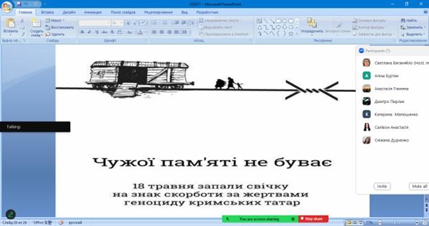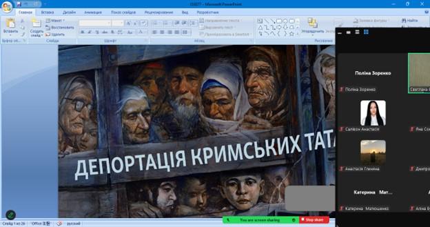 Під керівництвом куратора групи, завідувача кафедри соціально-економічних дисциплін Світлани Виганяйло відбувся інформаційно-просвітницький захід під назвою "Депортація кримських татар – історична пам’ять" для здобувачів вищої освіти другого курсу групи СФдср-23-1.