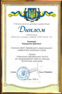 Також відзначено 5 переможців обласного конкурсу проєктів «STOP COVID-19», що проводився протягом травня 2020 року за ініціативи Сумської обласної державної адміністрації, серед яких у номінації «Юридична практика» отримав перемогу проєкт Сумської філії Харківського національного університету внутрішніх справ «Навчально-тренувальний полігон для відпрацювання навичок протидії біологічним загрозам».