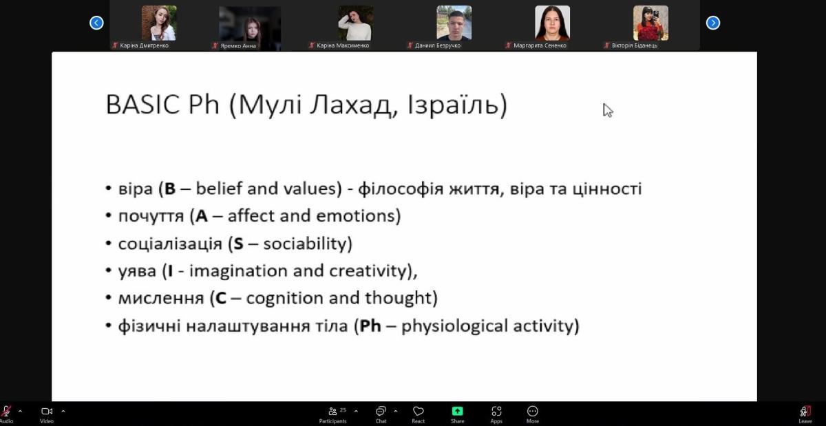 Учасники зустрічі мали змогу детально ознайомитися з моделлю BASIC Ph, яка фокусується на природних механізмах подолання стресу і складається із шести елементів стійкості : переконання і цінності; вираження почуттів і емоцій; соціальні зв’язки; логічне і критичне мислення; уява і творчість; фізична активність і тілесні відчуття.