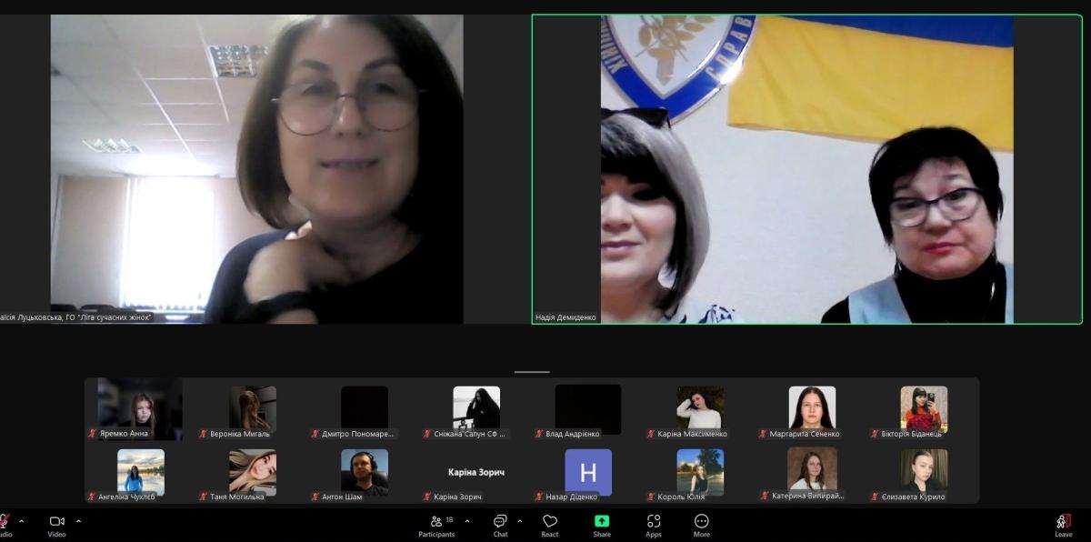 Для студентів 1-го та 2-го курсів спеціальності Право Сумської філії ХНУВС проведене бінарне заняття за організації доценток кафедри гуманітарних дисциплін Надії Демиденко і Тетяни Пономаренко, а також психологині, тренерки ГО «Ліга сучасних жінок» Таїсії Луцьковської.