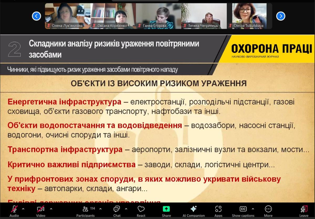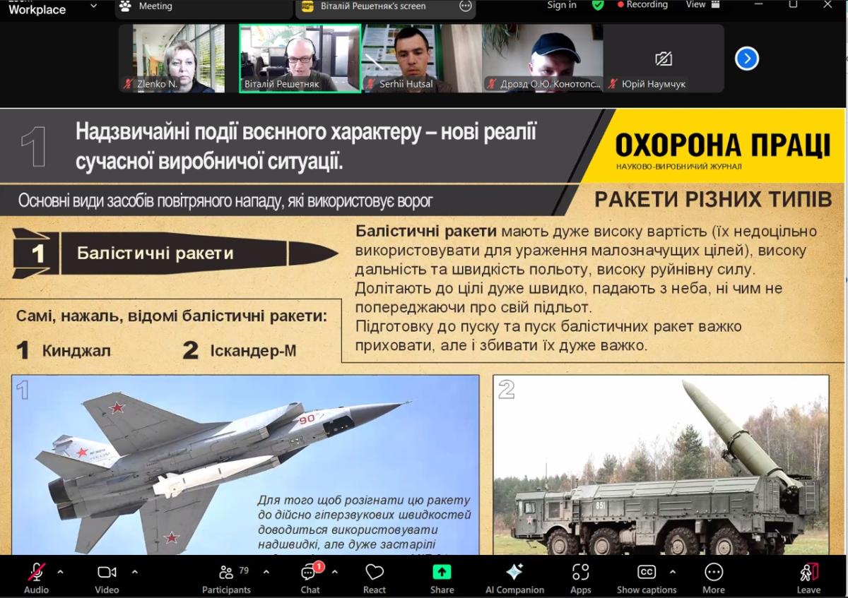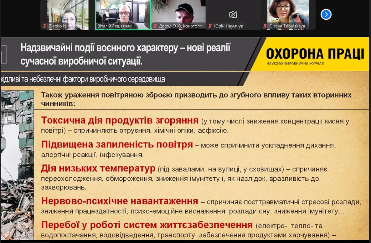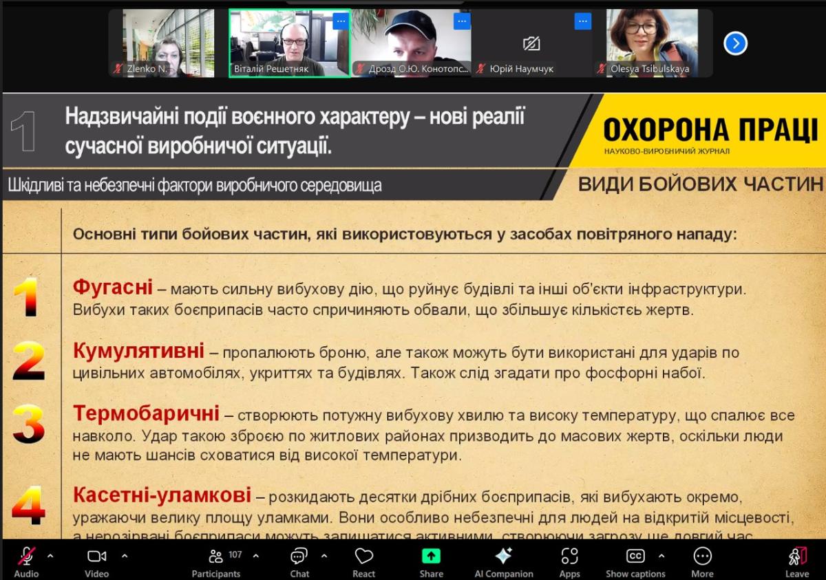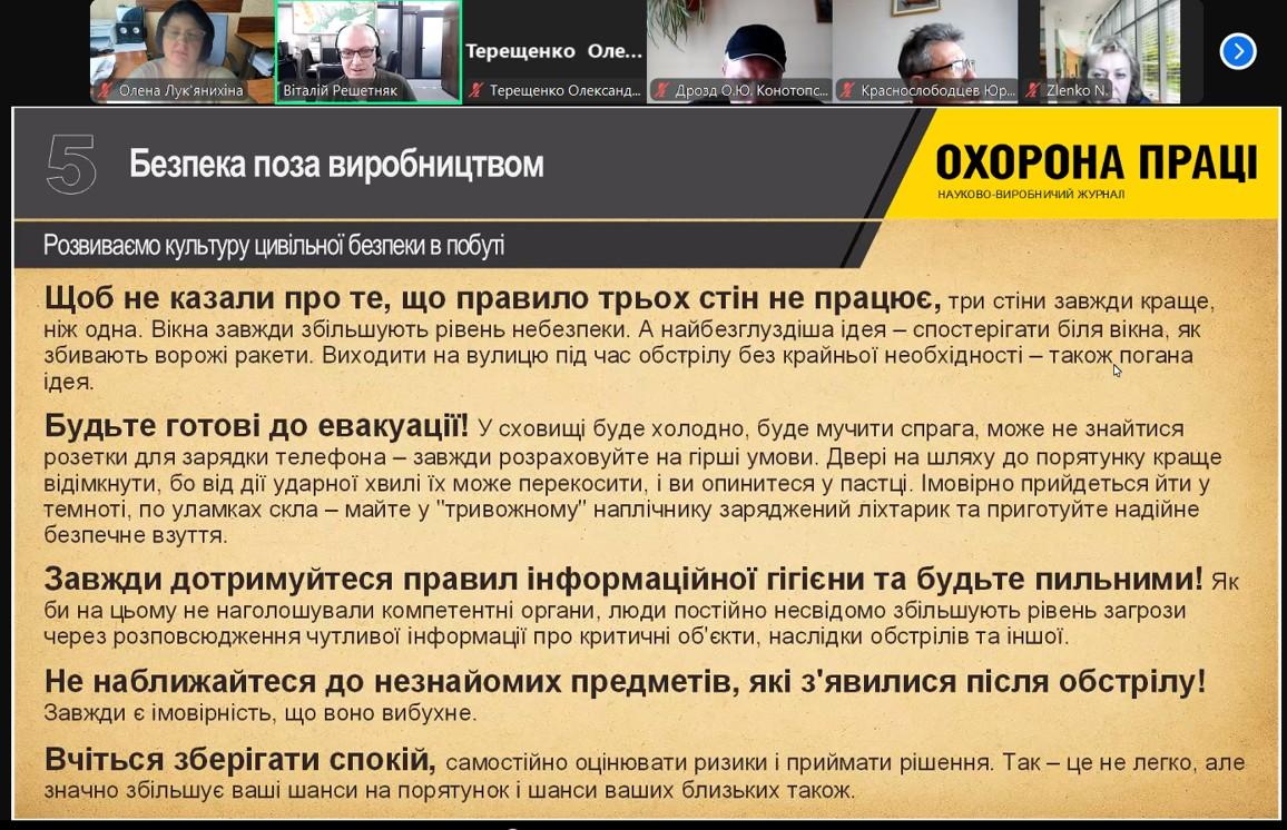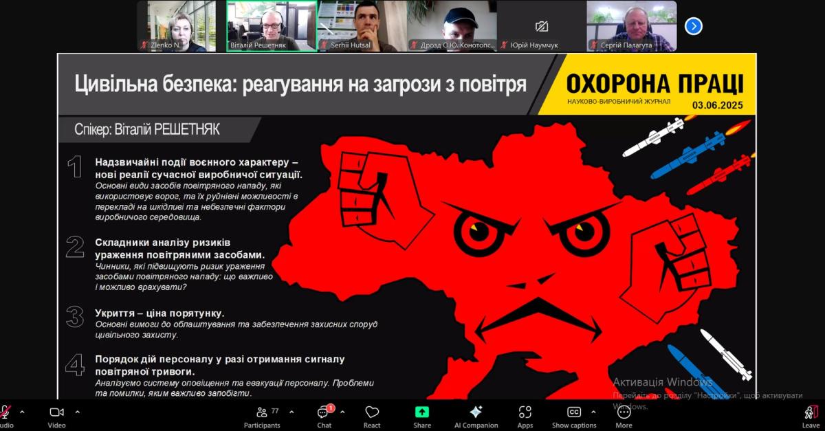 Ключовим спікером заходу виступив Віталій Решетняк – експерт з охорони праці та промислової безпеки у хімічній, нафтогазопереробній та видобувній галузях із понад 20-річним досвідом, нині – фахівець з безпеки військової служби у Збройних Силах України. У своєму виступі він акцентував увагу на ризиках для цивільного населення та персоналу виробництв в умовах збройної агресії, а також поділився практичними підходами до запобігання втратам у разі повітряних атак.