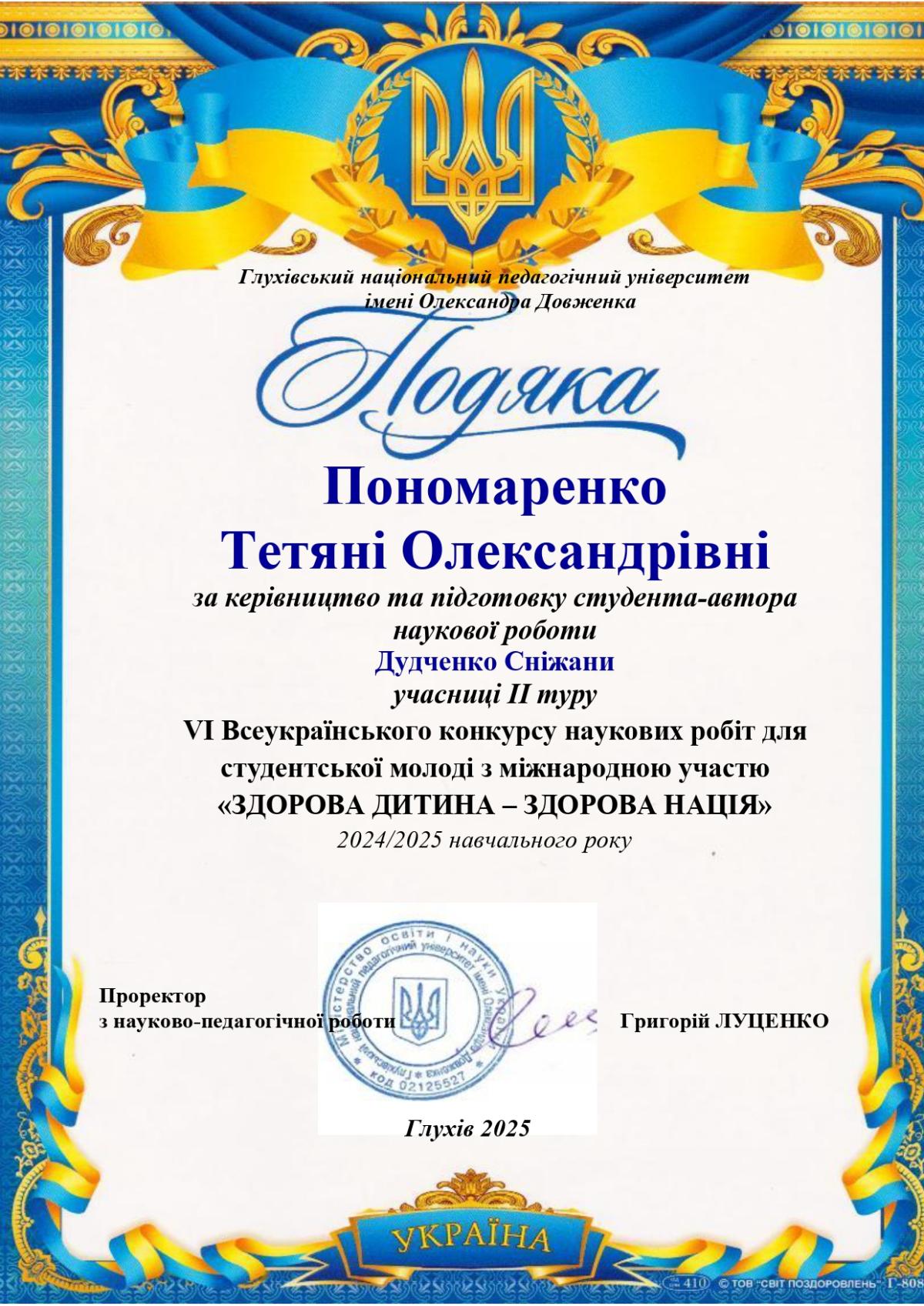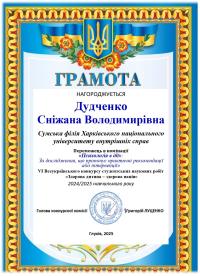 Вітаємо здобувачку вищої освіти 2 курсу спеціальності Правоохоронна діяльність Сумської філії ХНУВС Сніжану Дудченко із перемогою у VI Всеукраїнському конкурсі студентських наукових робіт «Здорова дитина – здорова нація» в номінації «Психологія в дії»: За дослідження, що пропонує практичні рекомендації або інтервенції».