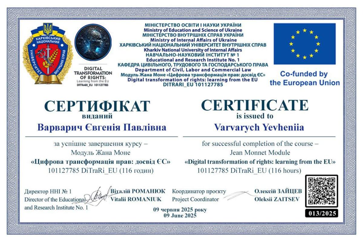 Здобувачі вищої освіти Сумської філії ХНУВС Євгенія Варварич, Ксенія Жерьобкіна, Анастасія Сапитон в межах провадження науково-дослідної роботи та діяльності наукового гуртка кафедри гуманітарних дисциплін «Veritas» успішно опанували курс Модуль Жана Моне «Цифрова трансформація прав: досвід ЄС» (DiTraRi_EU – 101127785), що реалізується ХНУВС за підтримки Виконавчого агентства з питань освіти, аудіовізуальних засобів і культури ЄС у межах програми Еразмус+.