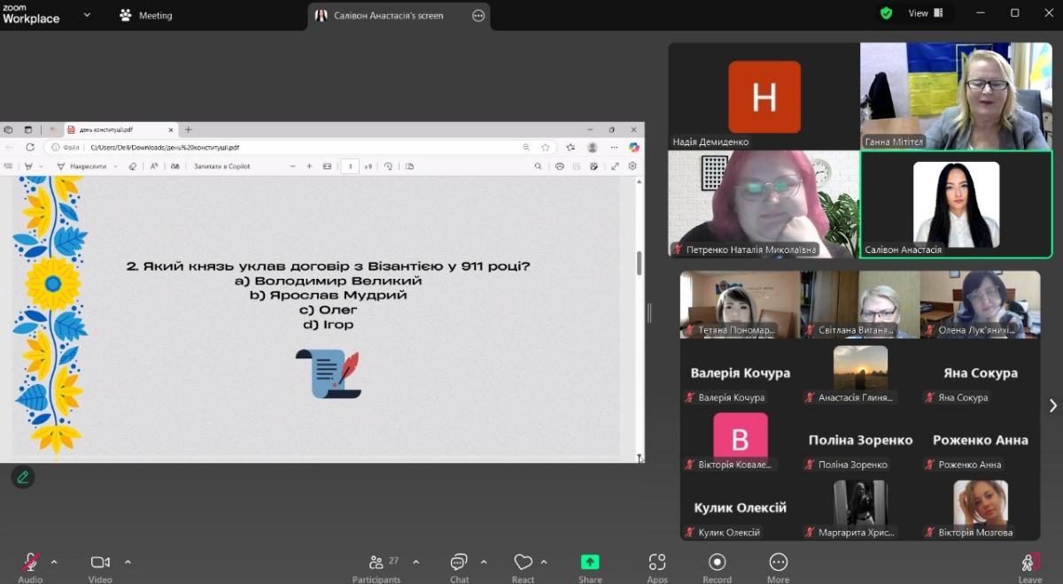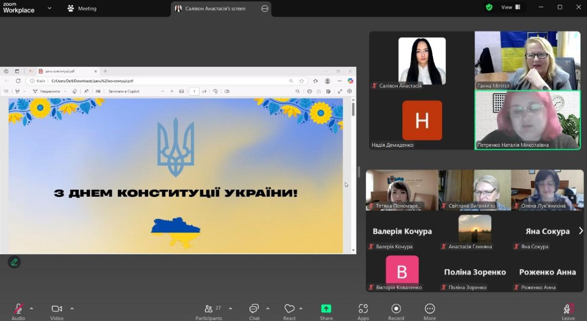 На завершення заходу студенти 1 та 2 курсу Анастасія Сапитон та Анастасія Салівон підготували тематичну вікторину. Студентська молодь продемонструвала відмінні знання з історії України та положень Конституції.