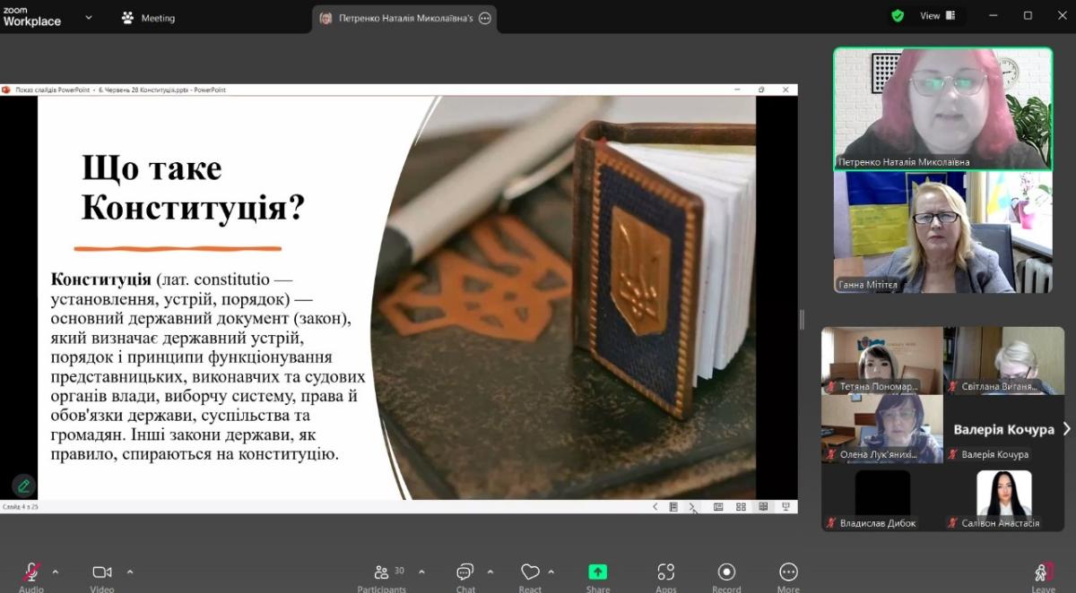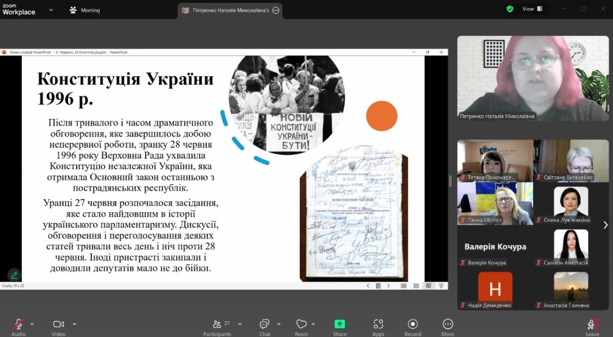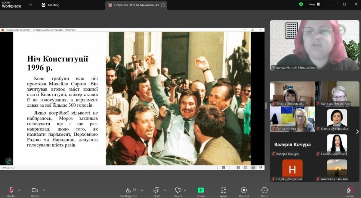 Пані Наталія здійснила захопливий історичний екскурс у розвиток правової думки України, висвітливши у своїй презентації ключові етапи становлення українського конституціоналізму – від Конституції Пилипа Орлика 1710 року до сучасного Основного Закону, прийнятого 28 червня 1996 року. Спікерка детальна розповіла про процес розробки Конституції, особливості її прийняття, а також згадала ніч, коли документ було затверджено. «Конституція – це головний гарант прав і свобод кожного громадянина. Вона не тільки об’єднує державу, але й нагадує нам про відповідальність перед суспільством», - наголосила пані Наталія під час свого виступу.