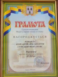 Команда курсантів Сумської філії здобула перемогу у загальноміському відео-конкурсі, і була нагороджена Грамотою відділу у справах молоді та спорту Сумської міської ради (червень, 2020).