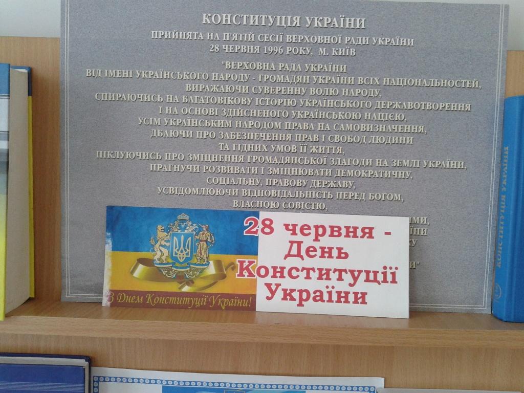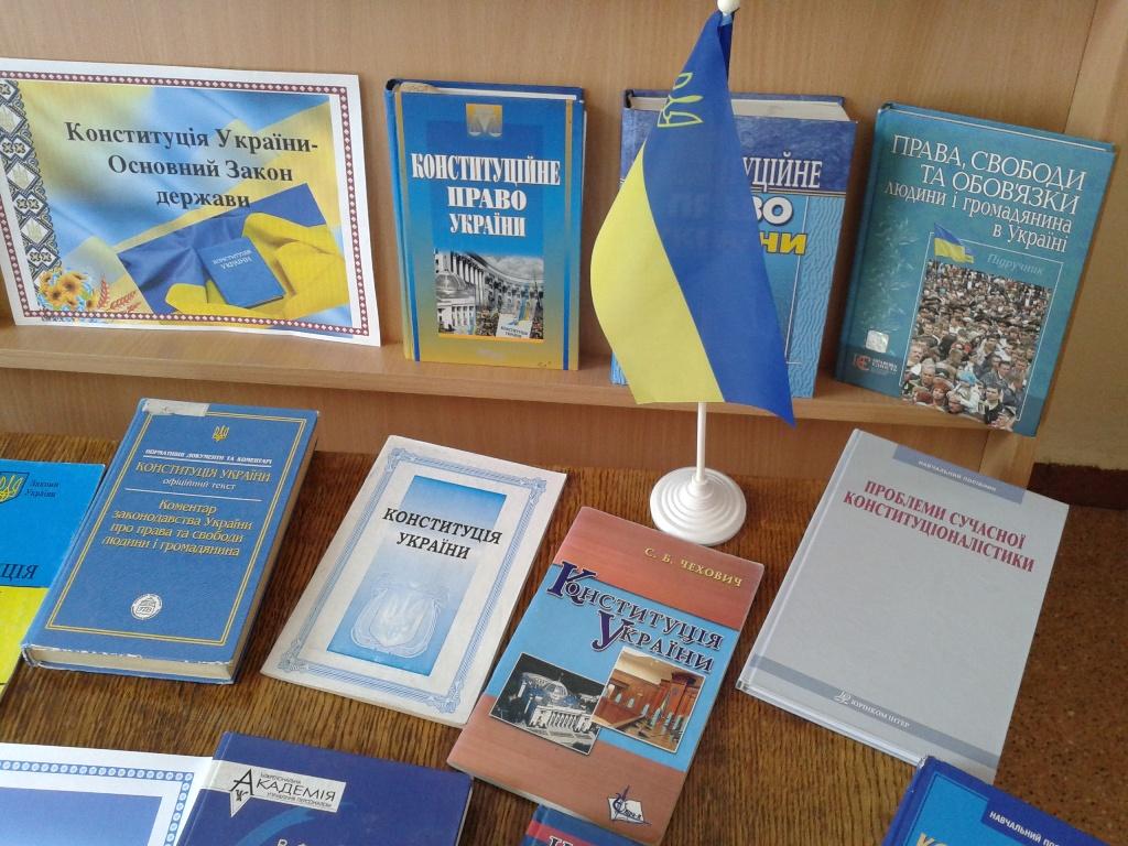 Мета виставки: ознайомлення користувачів з історією створення Конституції України та основними її засадами; формування правової культури та отримання знань про конституційні права і свободи; популяризація бібліотечних фондів.