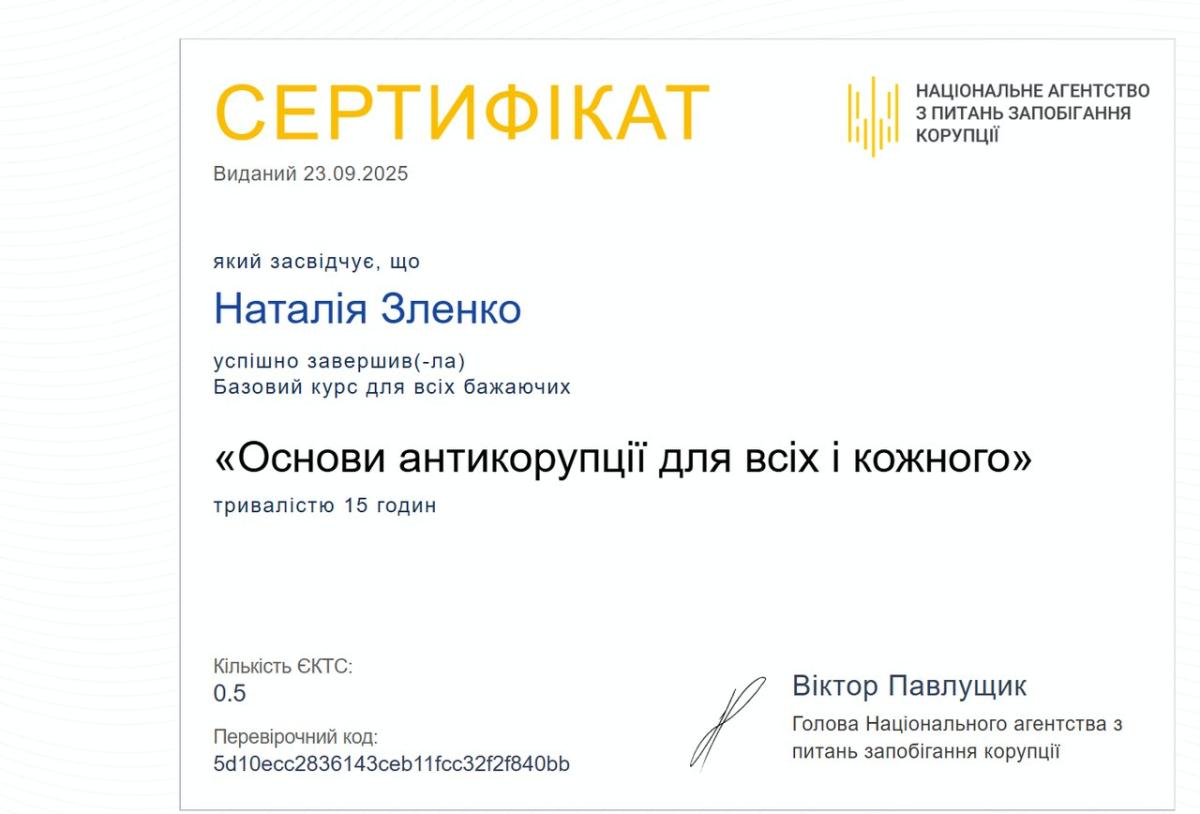 У рамках підвищення рівня обізнаності щодо антикорупційної політики та впровадження принципів академічної доброчесності в.о. завідувача кафедри гуманітарних дисциплін Юлія Самойлова та доцент цієї кафедри Наталія Зленко опанували онлайн-курс «Основи антикорупції для всіх і кожного», доступний на платформі Національного агентства з питань запобігання корупції (НАЗК).