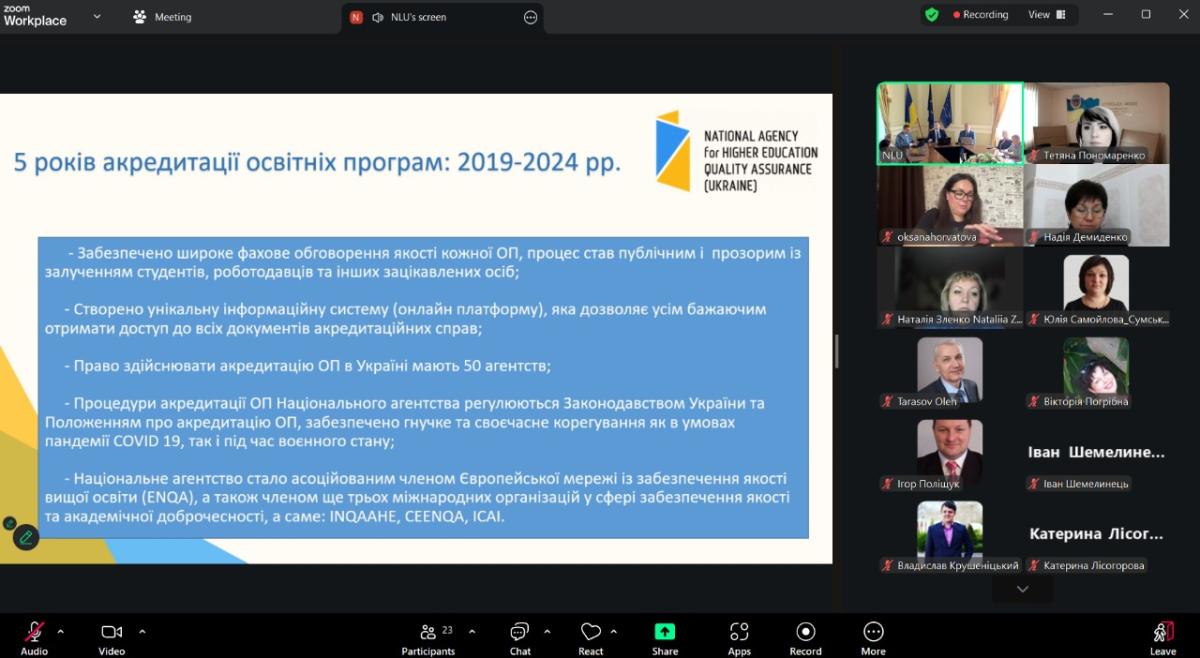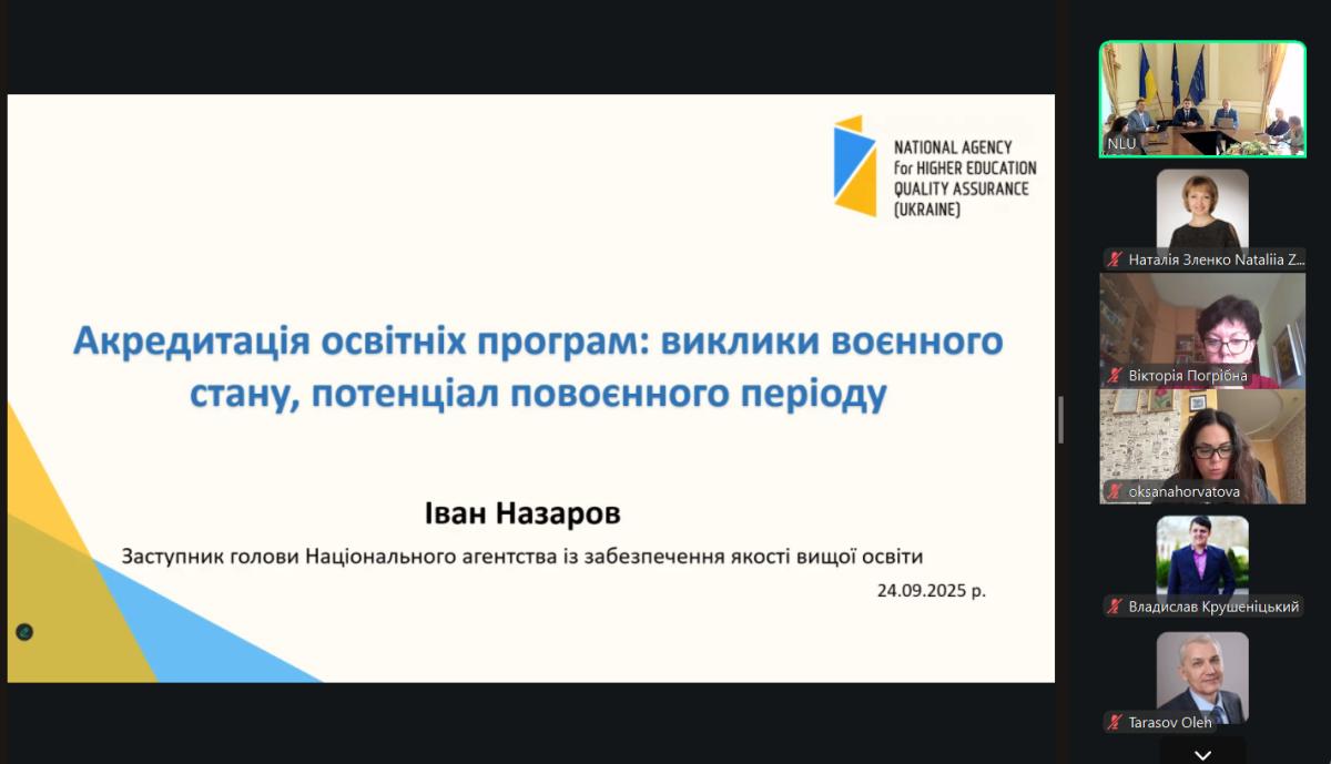 Захід проходив за участі провідних фахівців у сфері юридичної освіти, представників державних органів та академічної спільноти. Серед спікерів: Іван Назаров – доктор юридичних наук, професор, заступник голови Національного агентства із забезпечення якості вищої освіти (тема доповіді: «Акредитація освітніх програм: виклики воєнного стану, потенціал повоєнного періоду»); Сергій Мудрук – президент МГО «Універсальна екзаменаційна мережа» (тема доповіді: «ЄФВВ/ЄДКІ як один з ключових елементів системи забезпечення якості вищої юридичної освіти»); Тетяна Коломоєць – доктор юридичних наук, професор, член-кореспондент НАПрН України, заслужений юрист України, декан юридичного факультету Запорізького національного університету (тема доповіді: «ЄДКІ та його вплив на результати зовнішнього оцінювання якості освітніх програм за спеціальністю «Право»); Олександр Хименко – кандидат юридичних наук, керівник секретаріату НАЗЯВО (тема доповіді: «Проблеми системи забезпечення якості вищої освіти»); Надія Ковальчук – перший проректор Луцького національного технічного університету, кандидат економічних наук, доцент (тема доповіді: «Інституційна акредитація університету: досвід Луцького національного технічного університету»).