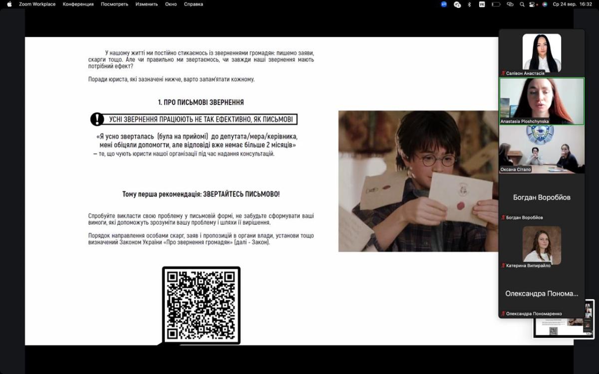 До участі у засіданні було запрошено Анастасію Площинську, керівника Хмельницького офісу Мережі правового розвитку (ГО «Подільська правова ліга»), адвоката, яка поділилася зі студентами власним практичним досвідом, звернувши увагу на ключові аспекти документообігу в діяльності юридичної клініки. Її виступ став цінним орієнтиром для майбутніх юристів у процесі набуття професійних компетентностей.