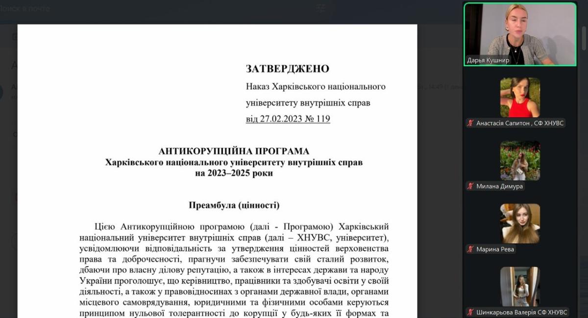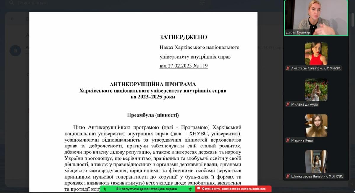 Окремим блоком була розглянута антикорупційна програма ХНУВС, яка передбачає прозорість освітнього процесу, нульову толерантність до будь-яких проявів недоброчесності, відповідальність кожного учасника навчального процесу за дотримання принципів чесності й справедливості.