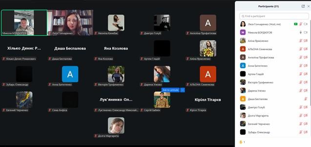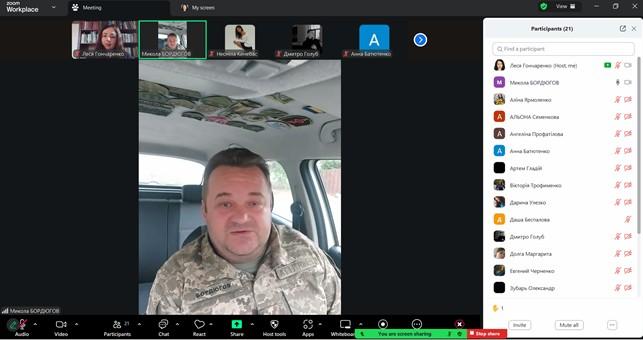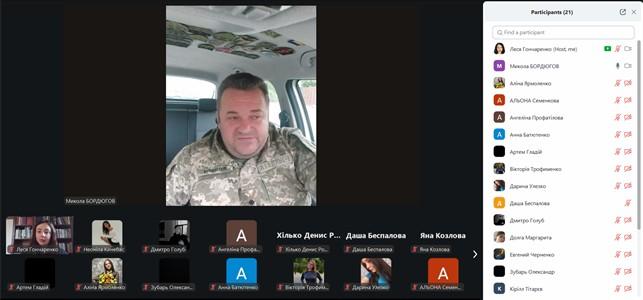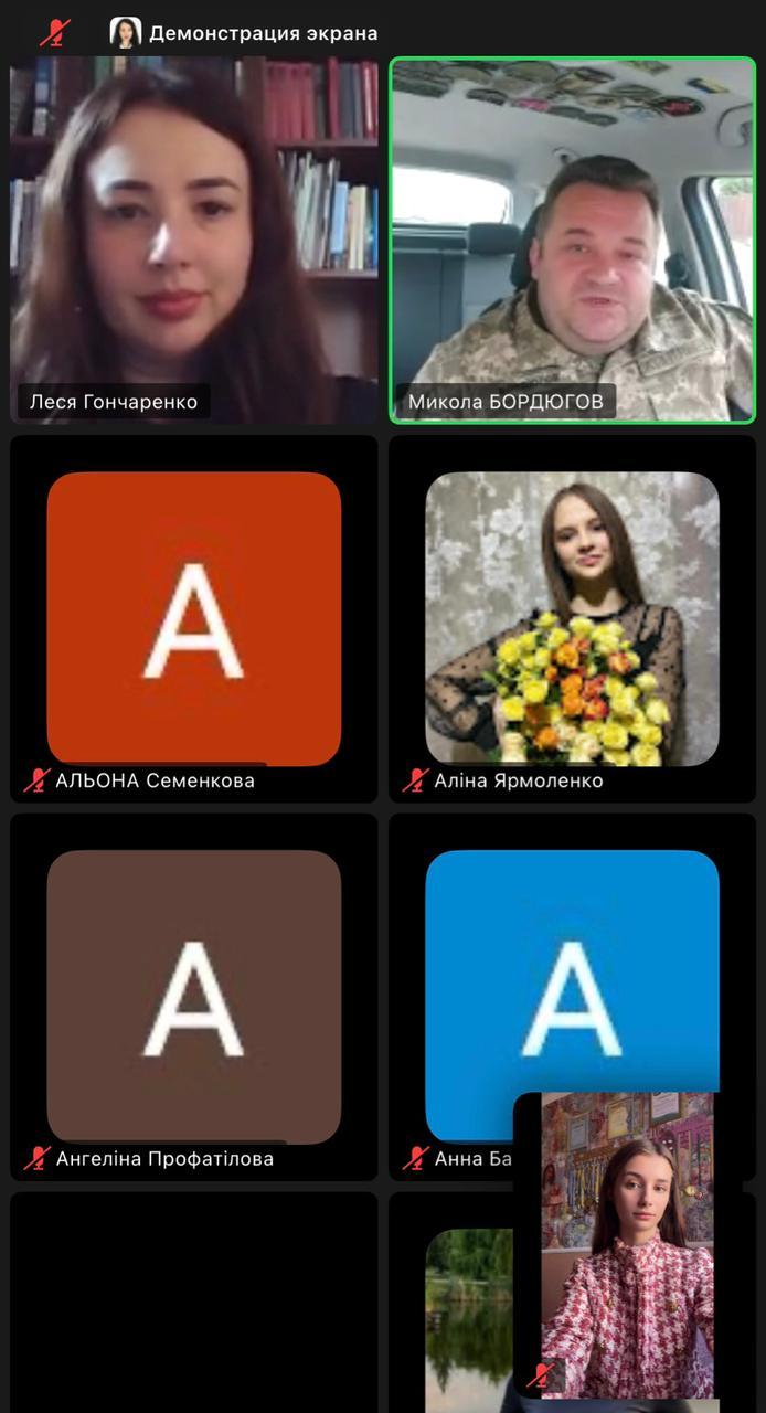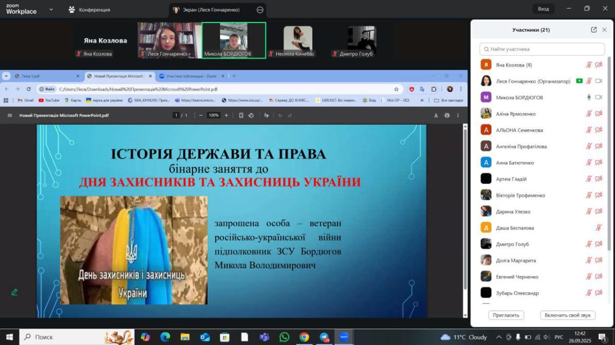 У межах навчальної дисципліни «Історія держави та права» відбулося бінарне заняття присвячене Дню захисників та захисниць України для студентів 1 курсу спеціальності К9 «Правоохоронна діяльність», організоване доцентом кафедри юридичних дисциплін Сумської філії ХНУВС Лесею Гончаренко спільно з підполковником ЗСУ Миколою Бордюговим.