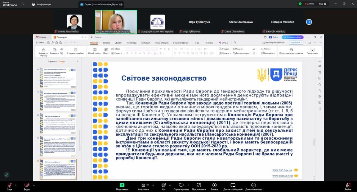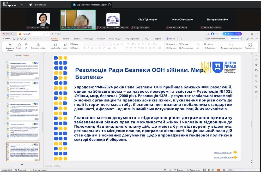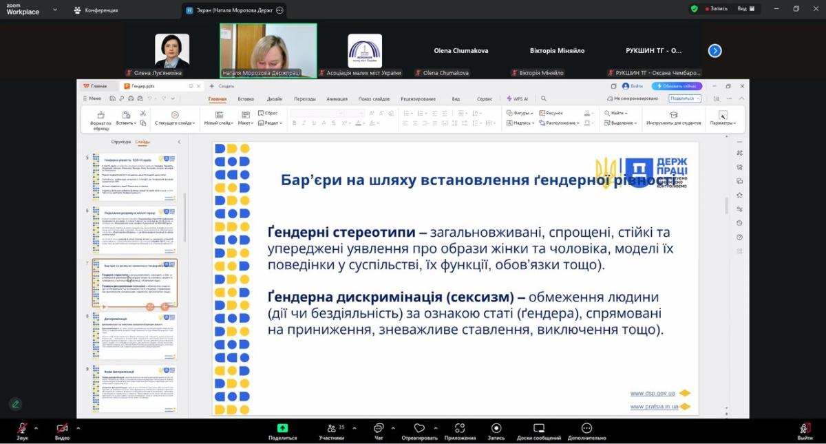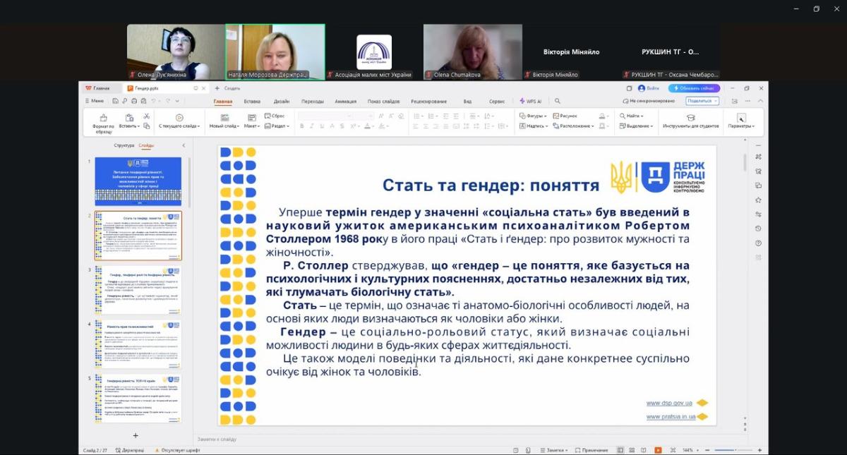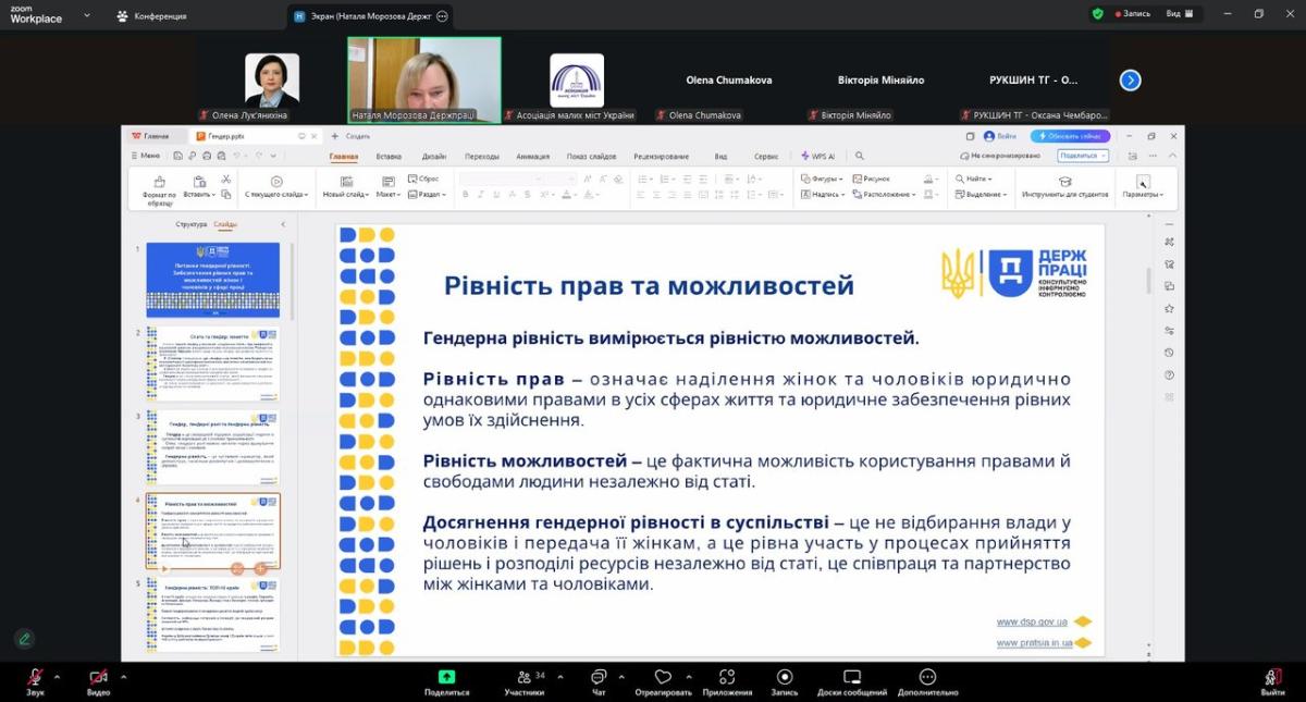 Завідувач кафедри соціально-економічних дисциплін Сумської філії Харківського національного університету внутрішніх справ Лук’янихіна Олена Анатоліївна долучилась до онлайн-заходу «Питання гендерної рівності», організатором якого стала Державна служба з питань праці за сприяння Асоціації малих міст України.