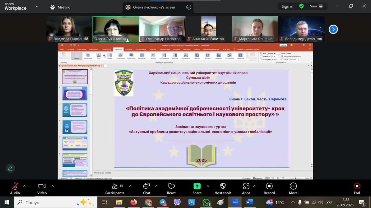На кафедрі соціально-економічних дисциплін Сумської філії ХНУВС відбулося онлайн-засідання наукового гуртка «Актуальні проблеми розвитку національної економіки в умовах глобалізації» на тему: «Політика академічної доброчесності університету - крок до Європейського освітнього і наукового простору».