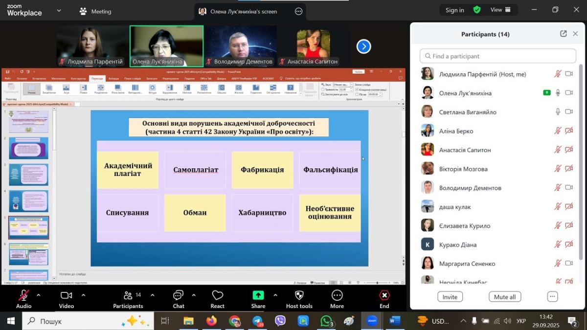 Олена Анатоліївна нагадала про основні документи що містять політику, стандарти і процедури дотримання академічної доброчесності і як вони корелюють з положеннями оновленої редакції Європейського кодексу академічної доброчесності. Зважаючи на майбутній фах здобувачів, було наголошено на тому, що дотримання принципів академічної доброчесності є запорукою формування репутаційного капіталу студентів і закладу освіти та важливим кроком до інтеграції у спільний Європейський науково-освітній простір на основі цінностей відкритості й поваги до авторських прав.