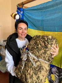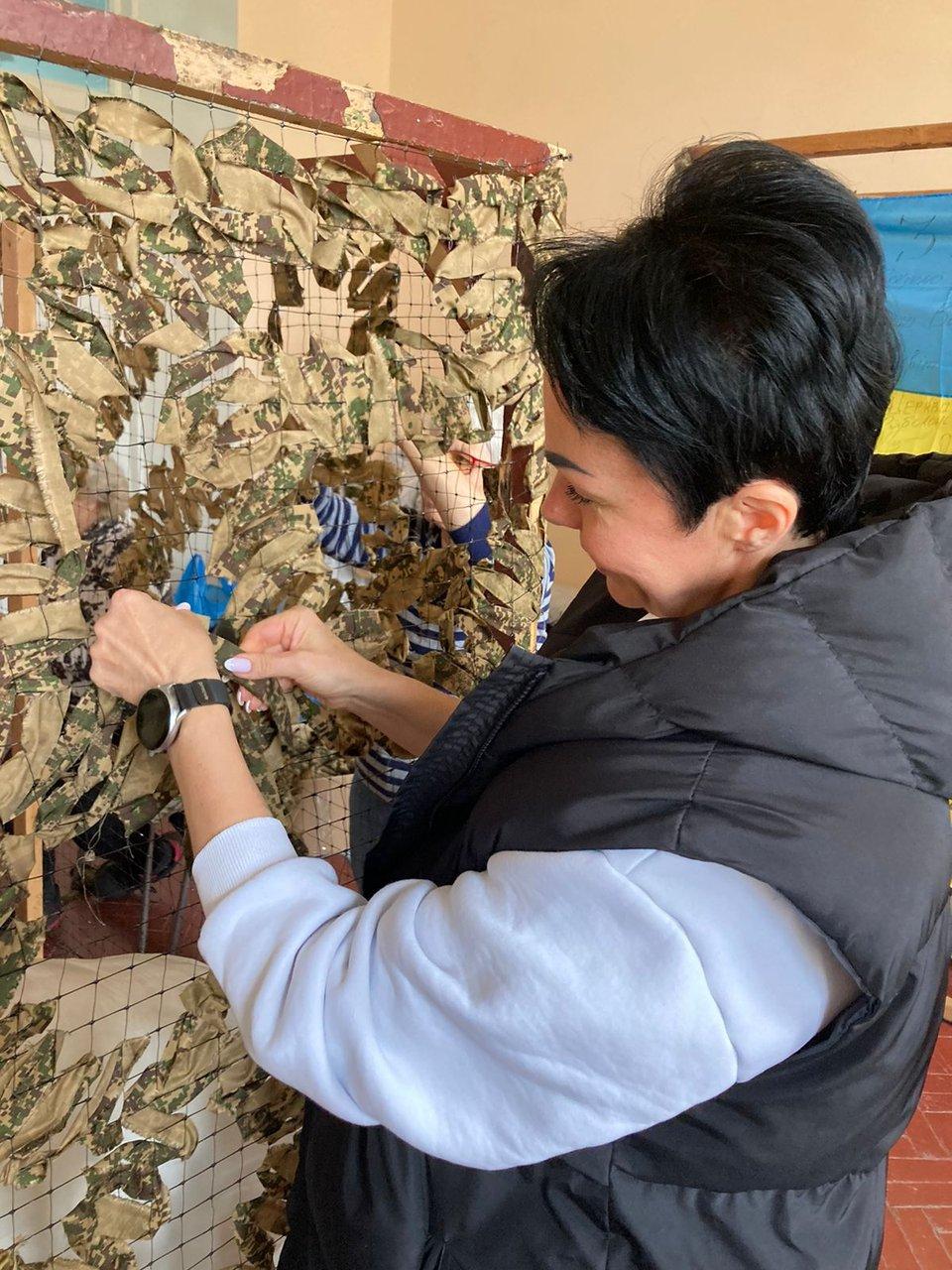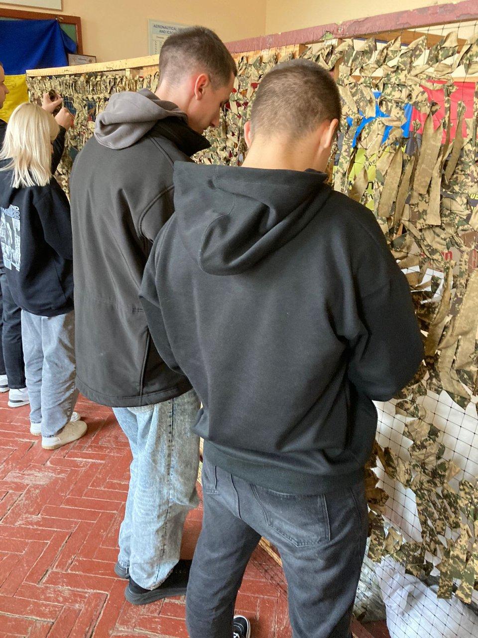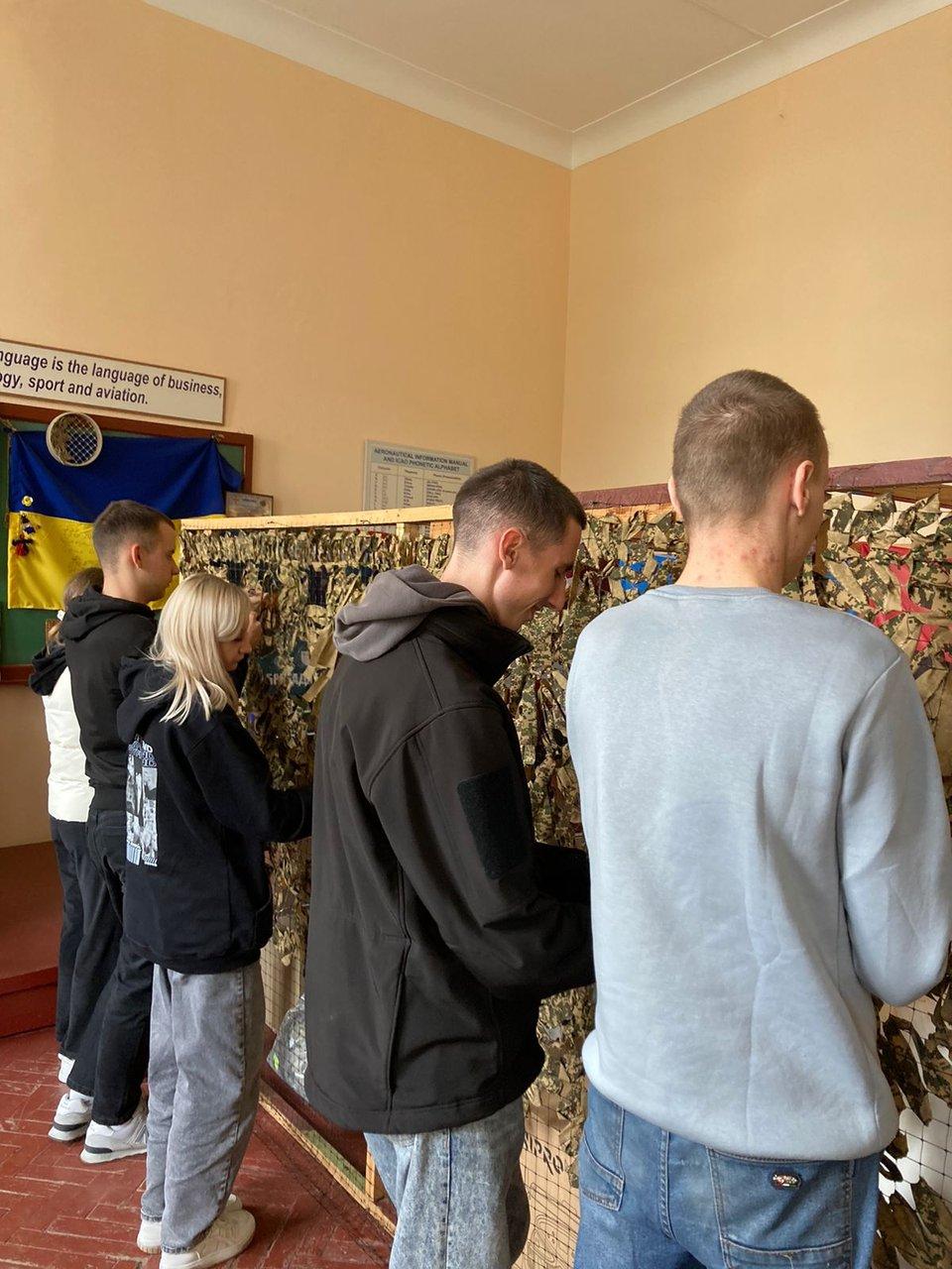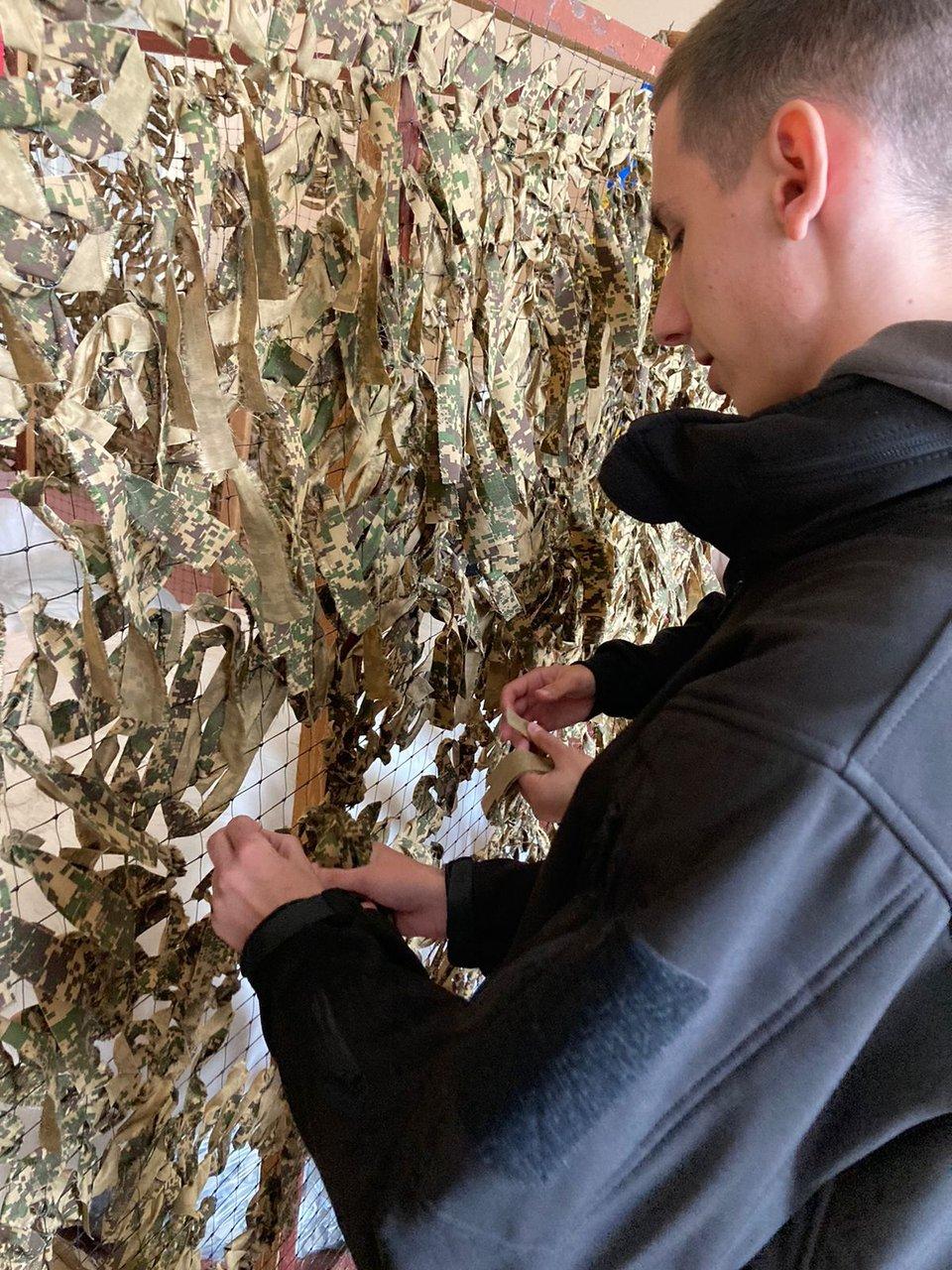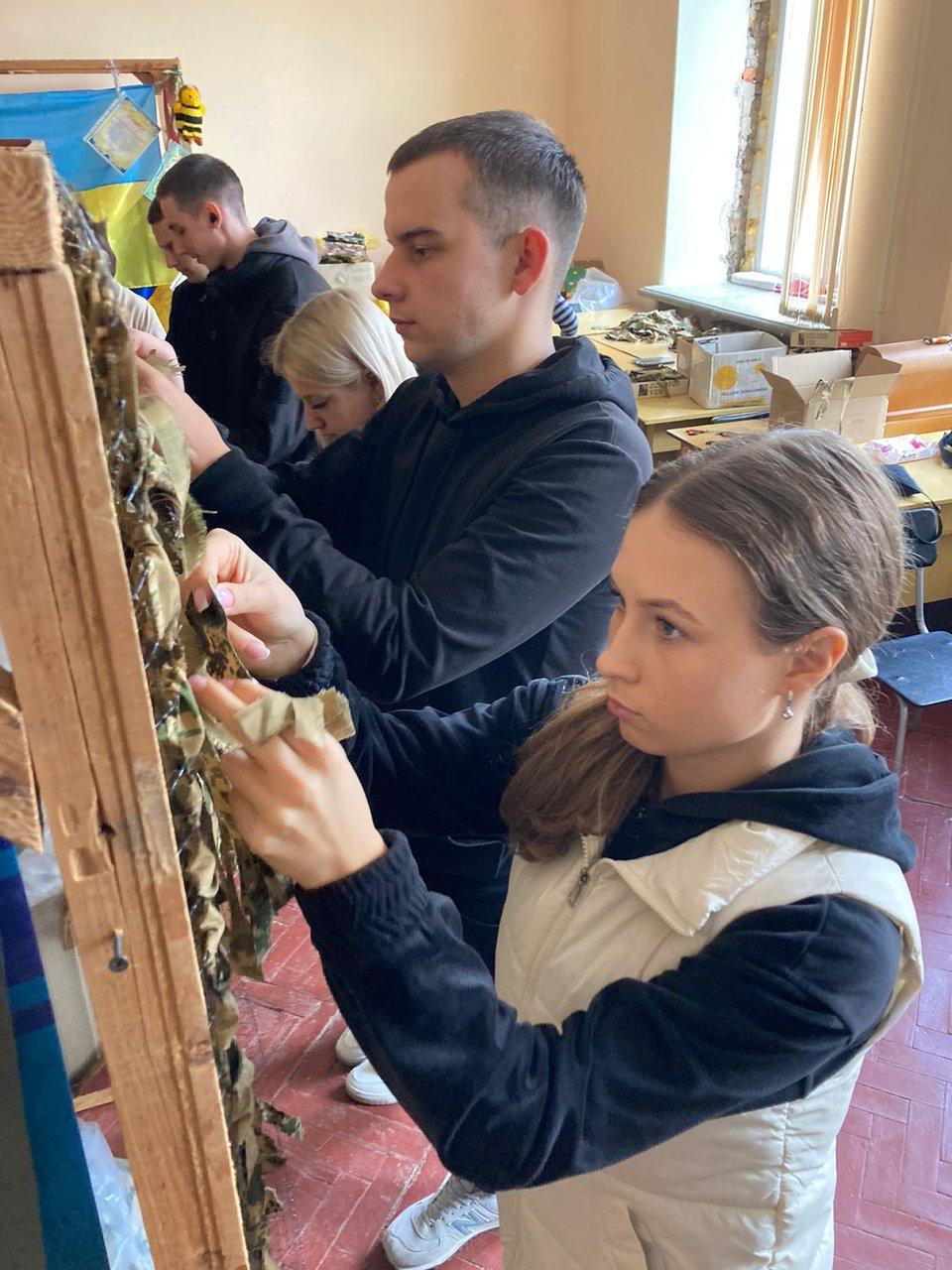 Здобувачі Сумської філії Харківського національного університету внутрішніх справ, представники студентсько-курсантського самоврядування та юридичної клініки, під керівництвом старшого викладача кафедри юридичних дисциплін Оксани Сітало відвідали волонтерську групу та долучилися до плетіння маскувальних сіток для потреб захисників України.