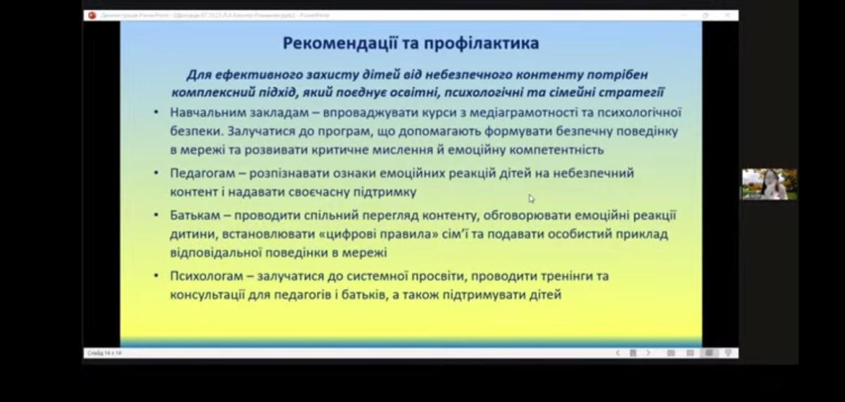Експерти із українських закладів освіти докладно висвітлили проблематику конференції, а учасники поглибили свої знання з таких напрямків: методики розпізнавання фейків, маніпуляцій і дезінформації; цифрова етика та культура поведінки в мережі; захист персональних даних учнів і педагогів; профілактика кібербулінгу та мова ворожнечі онлайн; інструменти контролю та безпеки вчителя під час роботи онлайн; співпраця школи з батьками у формуванні безпечного інформаційного середовища; психологічні аспекти впливу небезпечного контенту на дітей; нормативно-правова база та рекомендації МОН щодо безпечного контенту.
