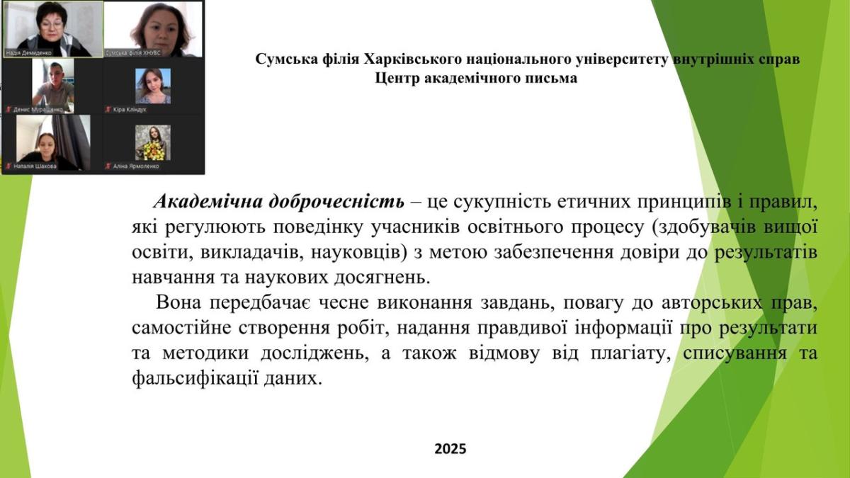 Професор кафедри гуманітарних дисциплін Сумської філії, керівник Центру Надія Демиденко, зазначила, що захід присвячений популяризації етичних норм у навчанні та науковій діяльності, адже академічна доброчесність передбачає правильне цитування джерел, надання достовірної інформації про свої дослідження та самостійне виконання робіт. Співробітник бібліотеки Сумської філії Дар’я Лук’яніхіна ознайомила здобувачів із переліком консультативних послуг, які можна отримати у бібліотеці при написанні наукових робіт.