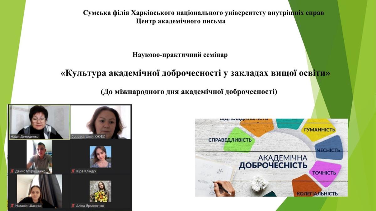 Напередодні Міжнародного дня академічної доброчесності, який відзначається 21 жовтня, у межах діяльності Центру академічного письма Сумської філії ХНУВС, для здобувачів вищої освіти 1 курсу спеціальності Правоохоронна діяльність був проведений науково-практичний семінар на тему «Культура академічної доброчесності в закладах вищої освіти».