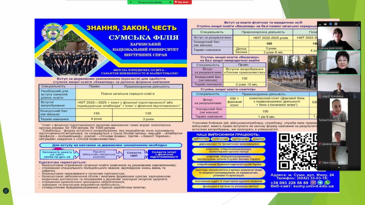 Професор кафедри гуманітарних дисциплін Сумської філії ХНУВС Надія Демиденко та здобувач вищої освіти спеціальності 081 Право (поліцейські) Катерина Лісовенко, за сприяння вчителя історії Тетяни Роженко, провели профорієнтаційну зустріч із старшокласниками Сумської ЗОШ №25. Учні були ознайомлені із умовами вступу до університету, перевагами навчання в нашому закладі вищої освіти та престижністю спеціальностей, за якими здійснюється підготовка фахівців.