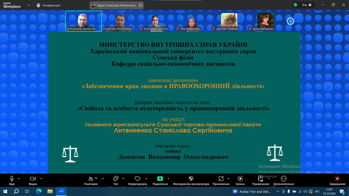 У рамках вивчення навчальної дисципліни «Забезпечення прав людини в правоохоронній діяльності» доцентом кафедри соціально-економічних дисциплін Сумської філії ХНУВС Володимиром Дементовим було організовано та проведено бінарне лекційне заняття з елементами дискусії для здобувачів вищої освіти 2-го курсу спеціальності «Правоохоронна діяльність», за участі випускника Сумської філії Харківського національного університету внутрішніх справ, головного юрисконсульта Сумської торгово-промислової палати Литвиненка Станіслава Сергійовича на тему: «Свобода та особиста недоторканість у правоохоронній діяльності».