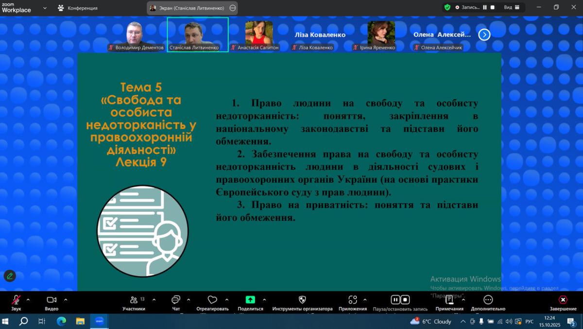 В рамках бінарного лекційного заняття було розглянуто тематичні питання: право людини на свободу та особисту недоторканність: поняття, закріплення в національному законодавстві та підстави його обмеження; забезпечення права на свободу та особисту недоторканність людини в діяльності судових і правоохоронних органів України (на основі практики Європейського суду з прав людини); право на приватність: поняття та підстави його обмеження.