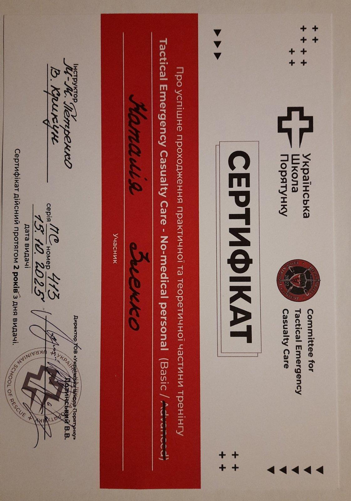 Доцент кафедри гуманітарних наук Сумської філії ХНУВС Наталія Зленко взяла участь в офлайн-тренінгу «Тактична невідкладна допомога пораненим». Захід проведено Українською школою порятунку (м. Київ) у межах проєкту «Підвищення рівня безпеки, захищеності та психічного здоров’я жінок і дівчат», який реалізується ГО «Дівчата» спільно зі Структурою ООН Жінки в Україні за підтримки урядів Швеції та Латвії.