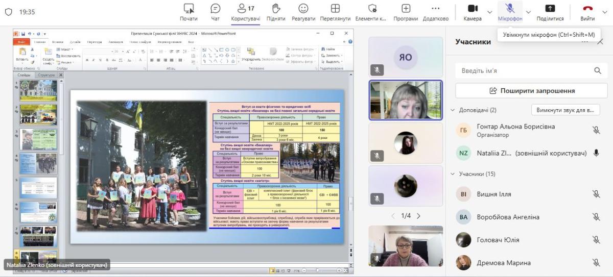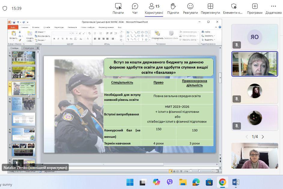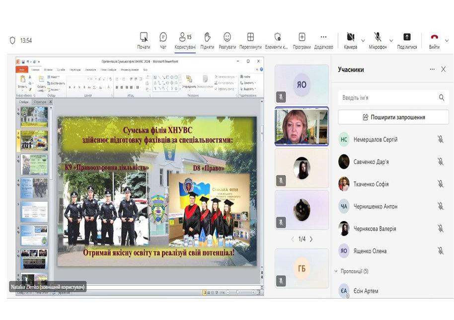 21 жовтня 2025 року доцент кафедри гуманітарних дисциплін Сумської філії ХНУВС Наталія Зленко провела профорієнтаційну онлайн-зустріч з випускниками КУ Сумська загальноосвітня школа І–ІІІ ступенів № 24.