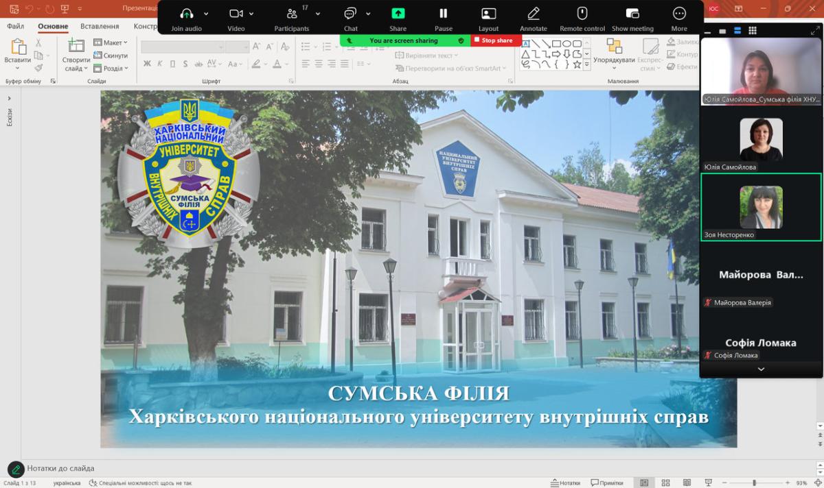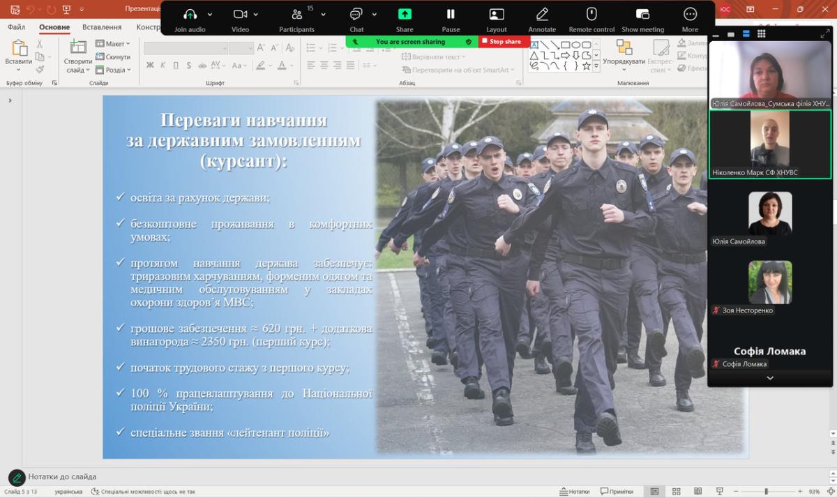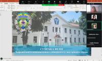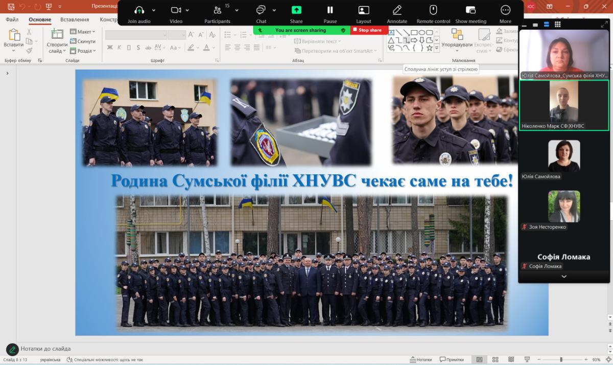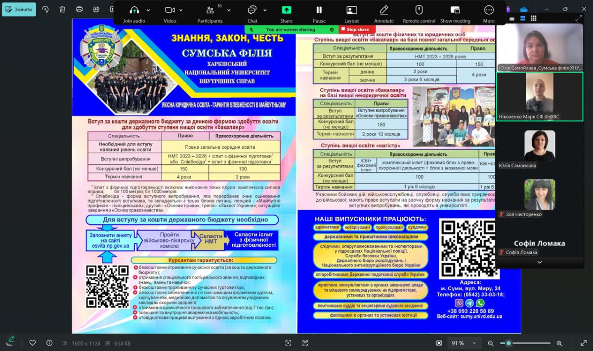 У межах проведення профорієнтаційної роботи в.о. завідувача кафедри гуманітарних дисциплін Сумської філії ХНУВС Юлія Самойлова та курсант 2 курсу, заступник голови студентсько-курсантського парламенту філії Марк Ніколенко провели онлайн-зустріч з учнями 11 класу школи № 5 м. Суми.