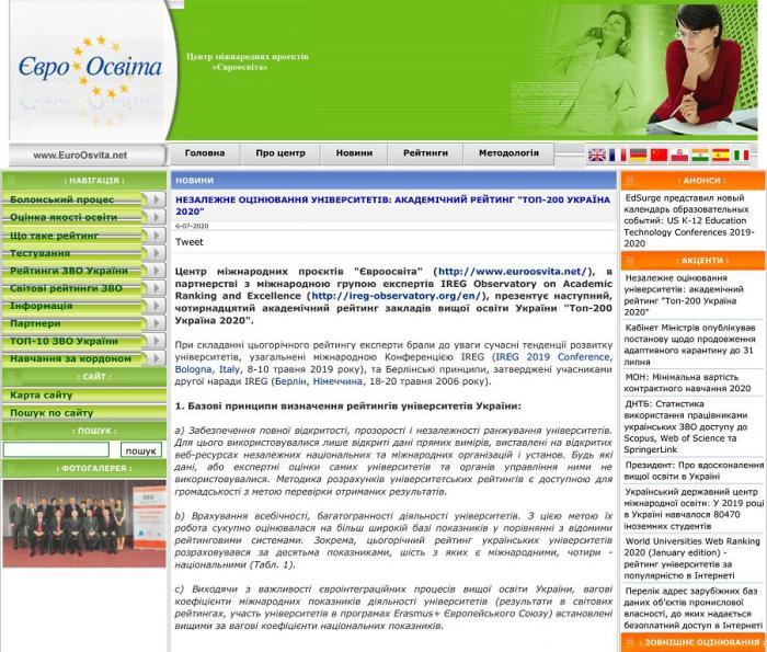 Центр міжнародних проєктів «Євроосвіта» (http://www.euroosvita.net/), в партнерстві з міжнародною групою експертів IREG Observatory on Academic Ranking and Excellence (http://ireg-observatory.org/en/), презентував наступний, чотирнадцятий академічний рейтинг закладів вищої освіти України «Топ-200 Україна 2020».