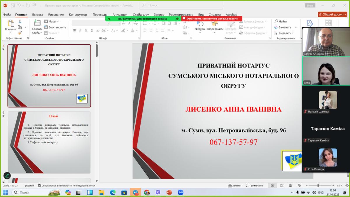 Студенти, які навчаються за спеціальностями «Право» та «Правоохоронна діяльність», долучилися до інтерактивного діалогу з приватним нотаріусом. Під час зустрічі приватний нотаріус Анна Лисенко (Сумський нотаріальний округ) поділилася зі студентами досвідом професійної діяльності та актуальними аспектами нотаріальної практики.