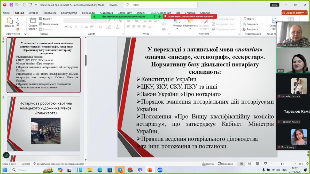 Під час заняття також було проаналізовано нормативно-правові акти Кабінету Міністрів України, зокрема постанови щодо порядку вчинення нотаріальних дій у період воєнного стану. Серед новел особливо відзначено запровадження з 8 жовтня 2025 року програми «Мій нотаріус», спрямованої на цифровізацію та спрощення доступу громадян до нотаріальних послуг.