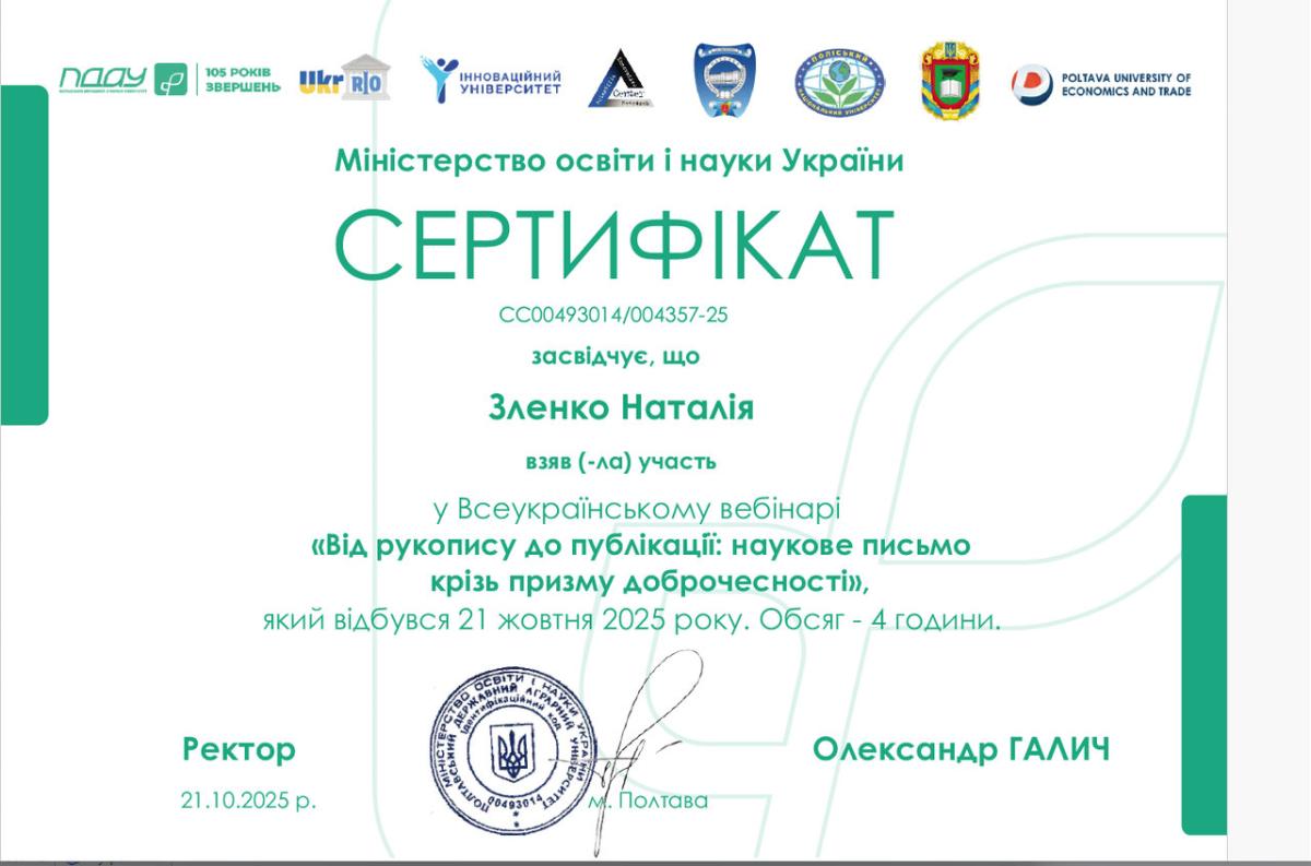 Доцент кафедри гуманітарних дисциплін Сумської філії Харківського національного університету внутрішніх справ Наталія Зленко взяла участь у Всеукраїнському вебінарі для аспірантів, наукових та науково-педагогічних працівників «Від рукопису до публікації: наукове письмо крізь призму доброчесності».
