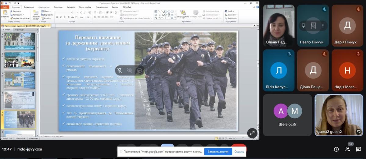 Під час зустрічі старшокласники дізналися про умови вступу до Сумської філії Харківського національного університету внутрішніх справ, освітні програми за спеціальностями «Право» та «Правоохоронна діяльність», а також про сучасні підходи до навчання, практичну підготовку та можливості професійного зростання майбутніх фахівців.