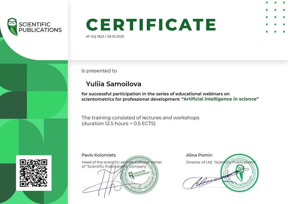 Сьогодні цифрові технології стрімко трансформують академічне середовище, відкриваючи нові можливості для підготовки, аналізу та представлення результатів наукових досліджень. Тема використання штучного інтелекту в науково-дослідницькій діяльності є надзвичайно актуальною для сучасних викладачів закладів вищої освіти. Так, в.о. завідувача кафедри гуманітарних дисциплін Сумської філії ХНУВС Юлія Самойлова взяла участь у вебінарі від науково-навчального центру компанії «Наукові Публікації» на тему «Штучний інтелект в науково-дослідницькій діяльності».