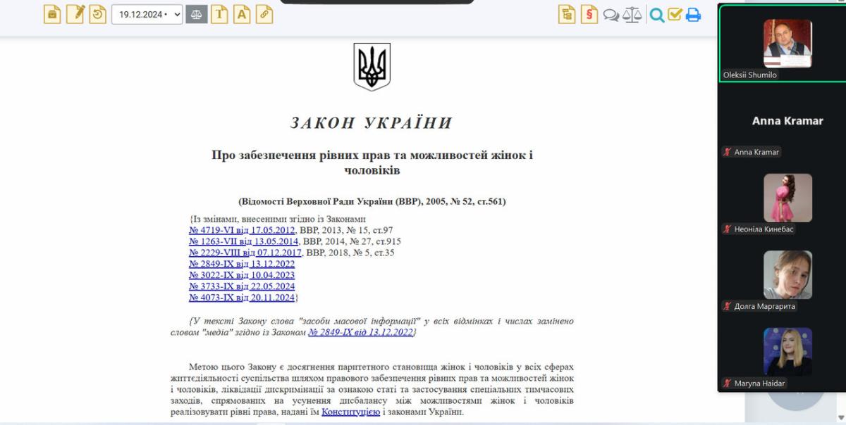 У межах теоретичної частини заняття професор О.М. Шуміло розкрив конституційно-правові засади рівності прав жінок і чоловіків, наголосив на практичному значенні дотримання принципу недискримінації у сфері публічної служби та правоохоронної діяльності. Викладачка Марина Гайдар зосередила увагу на формуванні гендерно чутливих підходів у майбутній професійній діяльності юристів. Запрошена спікерка поділилася практичним досвідом реалізації ініціатив, спрямованих на підтримку жінок і дівчат, які зазнали насильства, а також підкреслила роль громадських організацій у забезпеченні партнерства між державними структурами та громадянським суспільством.