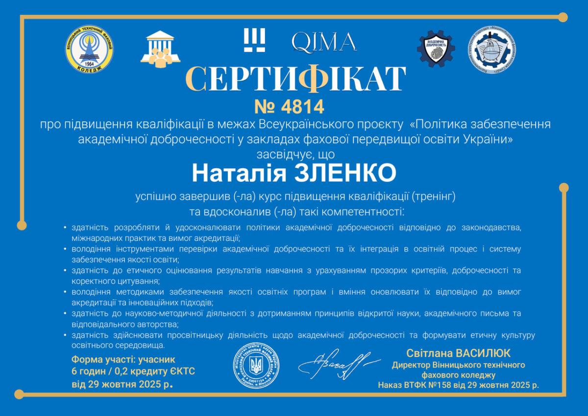 У межах цієї діяльності доцент кафедри гуманітарних дисциплін Наталія Зленко взяла участь у Всеукраїнському проєкті «Політика забезпечення академічної доброчесності у закладах фахової передвищої освіти України», організованому Вінницьким технічним фаховим коледжем.