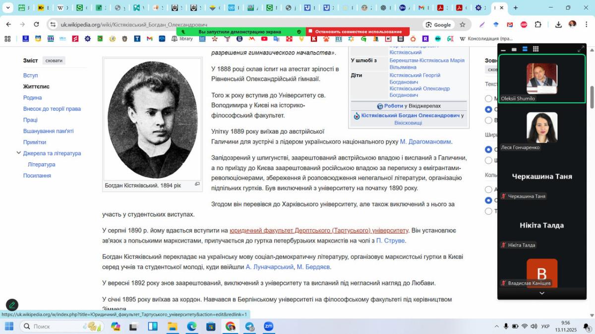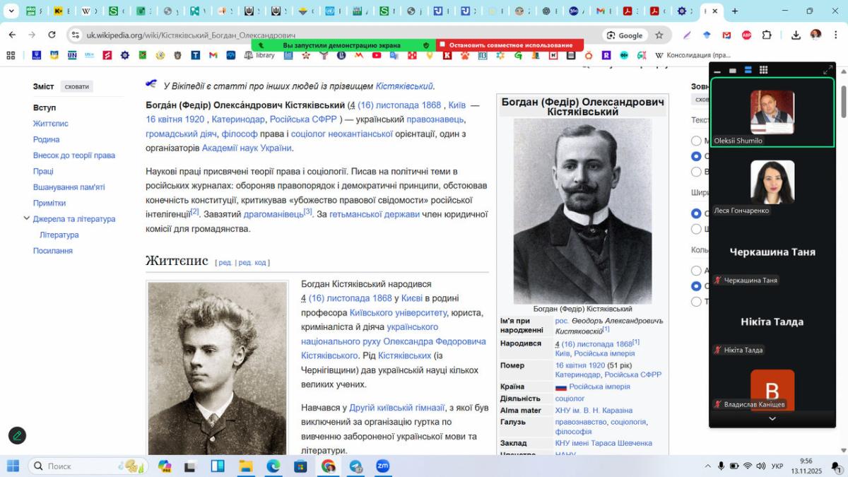 Під час засідання професор Олексій Шуміло та доцент Леся Гончаренко ознайомили учасників із біографією та науковою спадщиною Б.О. Кістяківського, зокрема його внеском у розвиток теорії права, соціологічного та нормативного підходів, концепції правової держави, а також ключовими ідеями щодо ролі права у демократичному суспільстві. Студенти мали можливість обговорити основні положення праць ученого, що стали класичними для європейської правової думки та суттєво вплинули на подальший розвиток юридичної науки в Україні.