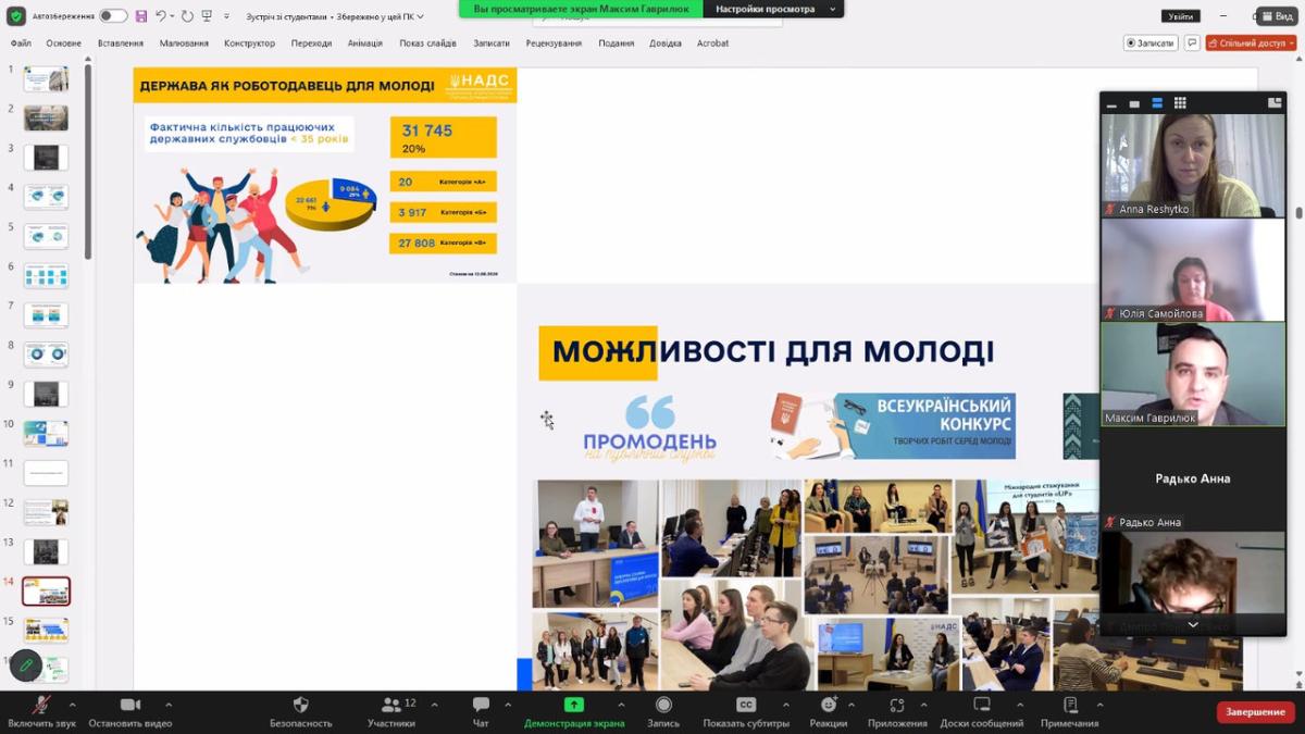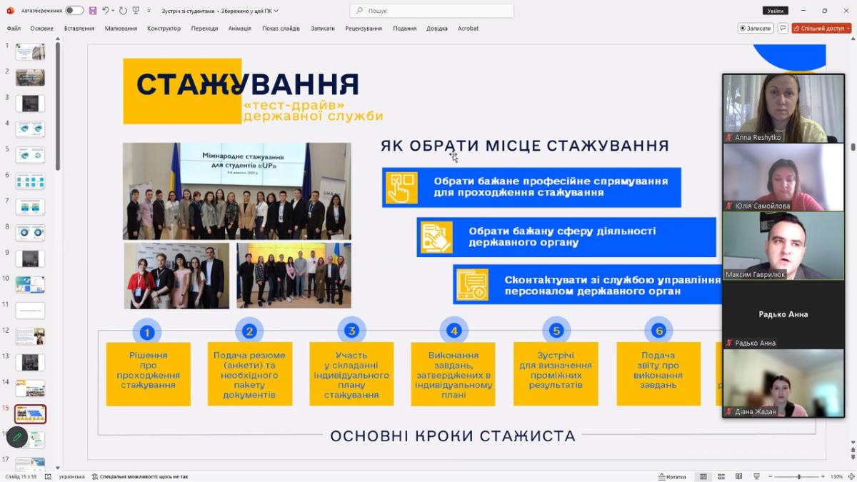 Під час заняття обговорювалися питання та можливості працевлаштування на державну службу, особливості кар’єрного зростання, вимоги до кандидатів і сучасні підходи до підготовки майбутніх фахівців.
