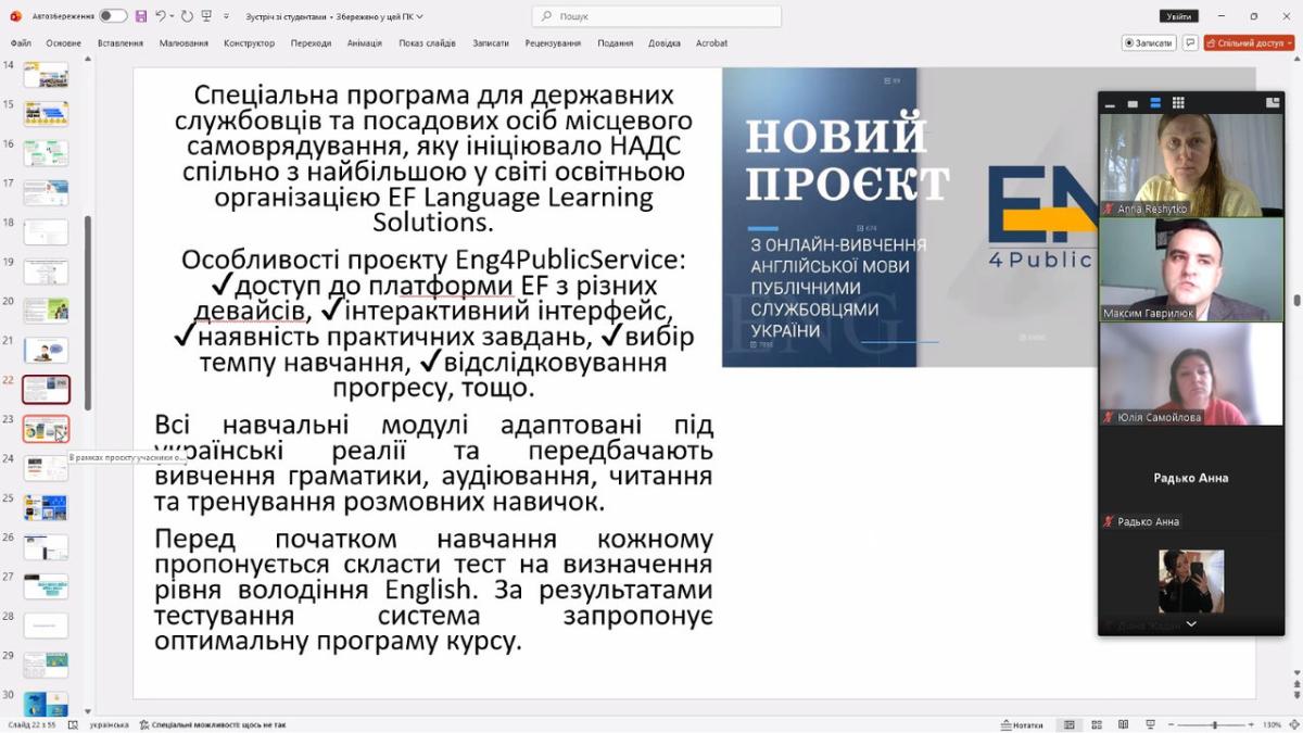 Для студентів 3 курсу спеціальності «Право» з навчальної дисципліни «Іноземна мова» в.о. завідувача кафедри гуманітарних дисциплін Юлією Самойловою та старшим викладачем цієї кафедри Анною Решитько було проведено бінарне заняття за участі начальника Центрального міжрегіонального управління Національного агентства України з питань державної служби (НАДС) Гаврилюка Максима Петровича.