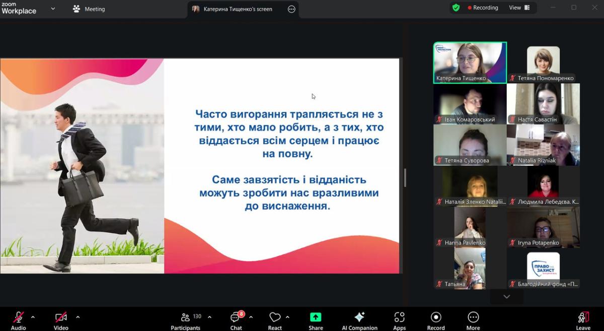 Під час онлайн-зустрічі учасники отримали ґрунтовні пояснення щодо природи професійного вигорання, його ключових причин та ранніх ознак. Спікер детально розповіла про ефективні методи відстеження власного емоційного стану, техніки саморегуляції та інструменти відновлення ресурсів у періоди підвищеного навантаження. Особливу увагу було приділено практичним рекомендаціям щодо збереження психологічної стійкості, формування здорових меж у професійній діяльності та профілактики виснаження. У ході вебінару викладачі мали можливість осмислити власні професійні виклики та отримати дієві поради для підтримання ментального здоров’я.
