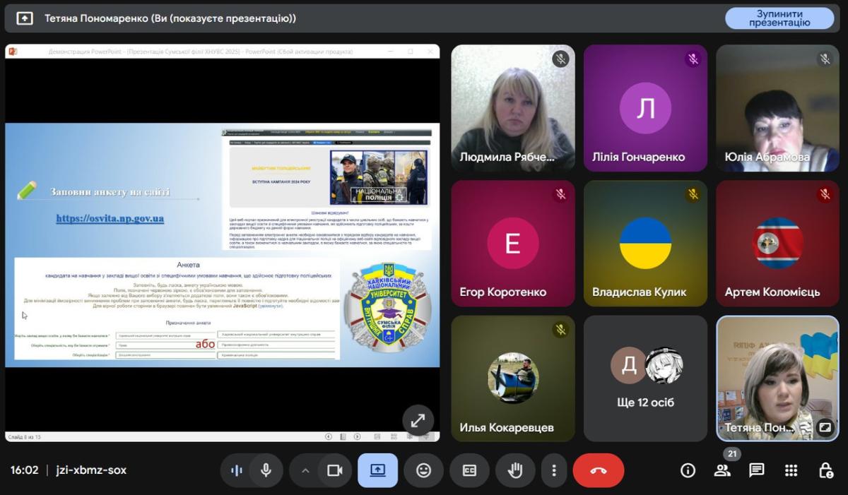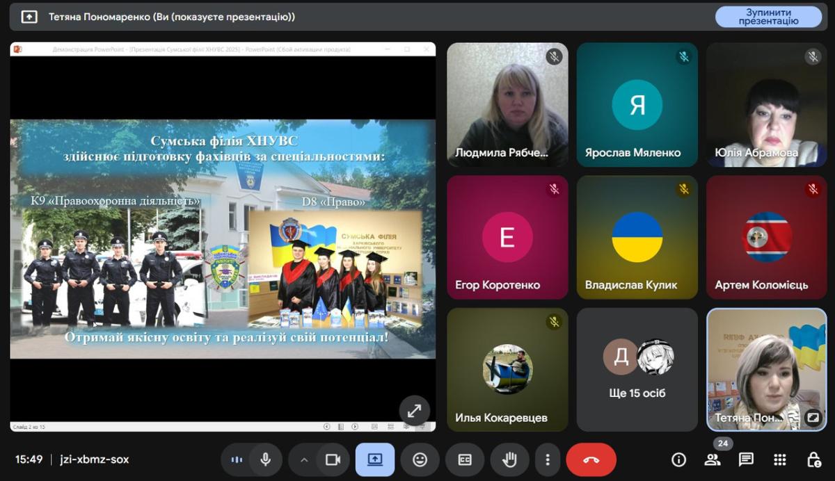 Відповідно до плану профорієнтаційної роботи доцентом кафедри гуманітарних дисциплін Сумської філії ХНУВС Тетяною Пономаренко організована і проведена зустріч із здобувачами КУ Сумська загальноосвітня школа І-ІІІ ступенів № 20 на тему «Переваги навчання у Сумській філії ХНУВС», в межах якої була презентована філія як один із провідних закладів вищої освіти Сумщини, представлено основні спеціальності, за якими здійснюється підготовка майбутніх фахівців, а також особливості вступу та здобуття освіти у закладі вищої освіти зі специфічними умовами навчання.