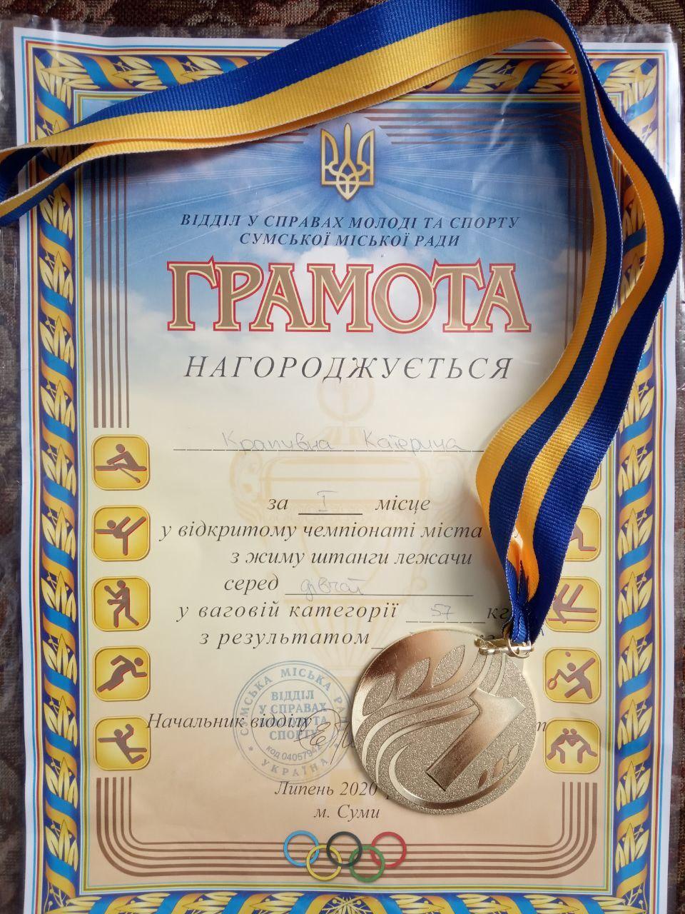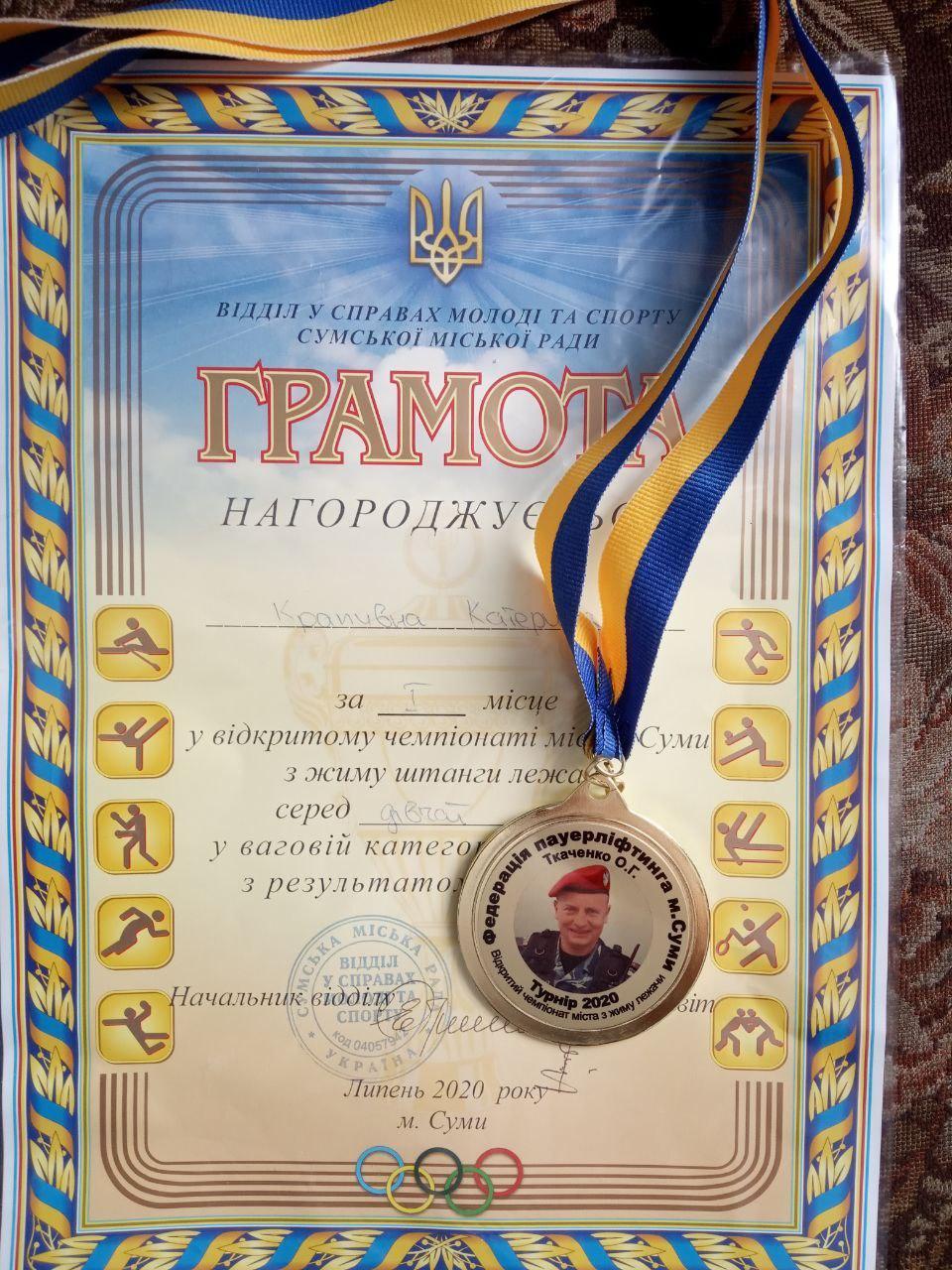 Курсантка Сумської філії Харківського національного університету внутрішніх справ Крапивна Катерина здобула перемогу на відкритому чемпіонаті міста з жиму лежачи, присвяченому пам’яті учасника АТО Олександра Ткаченка. Даний захід був організований відділом у справах молоді та спорту Сумської обласної державної адміністрації спільно з ГО «Федерація пауерліфтингу м. Суми». Змагання проводилось серед спортсменів з ураженням ОРА, ветеранів, дівчат, юніорок, жінок, юнаків, юніорів та чоловіків з дотриманням всіх санітарних та протиепідемічних заходів.