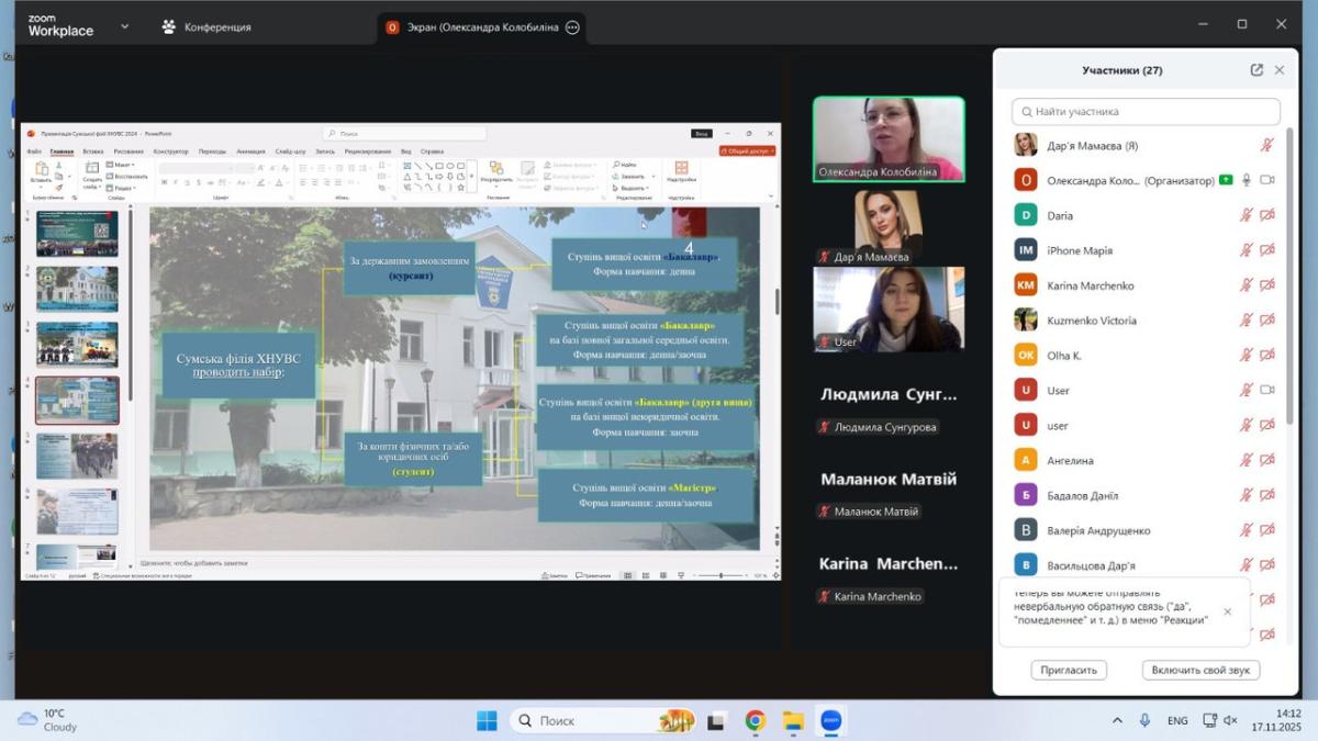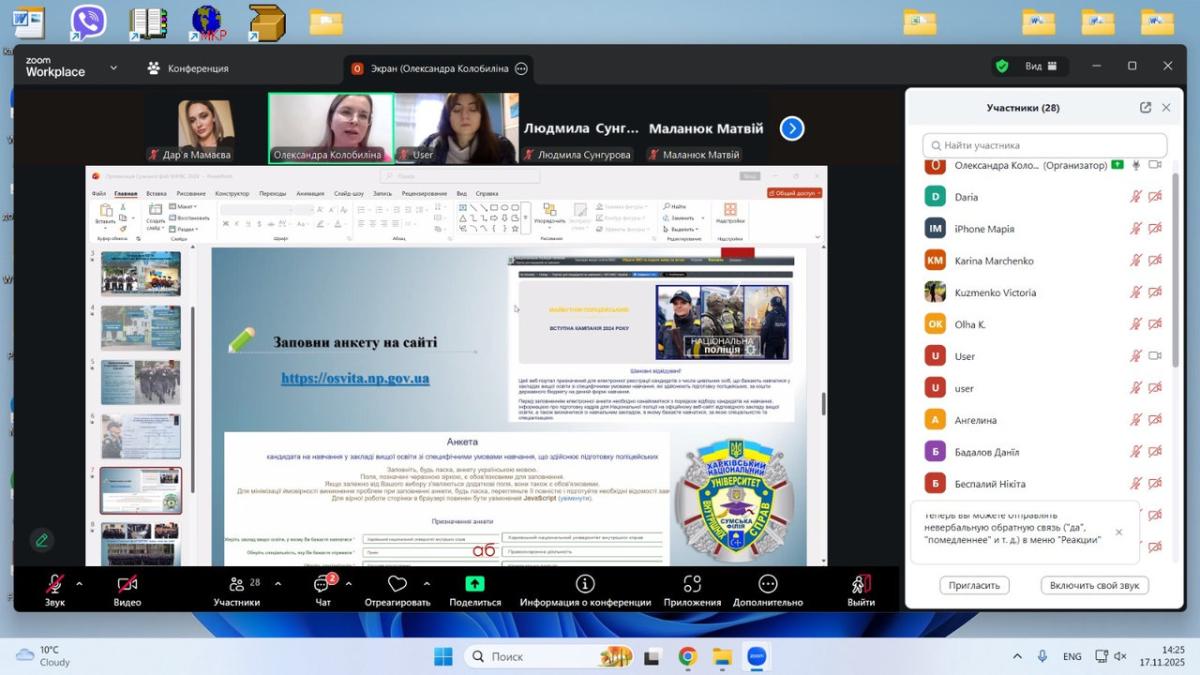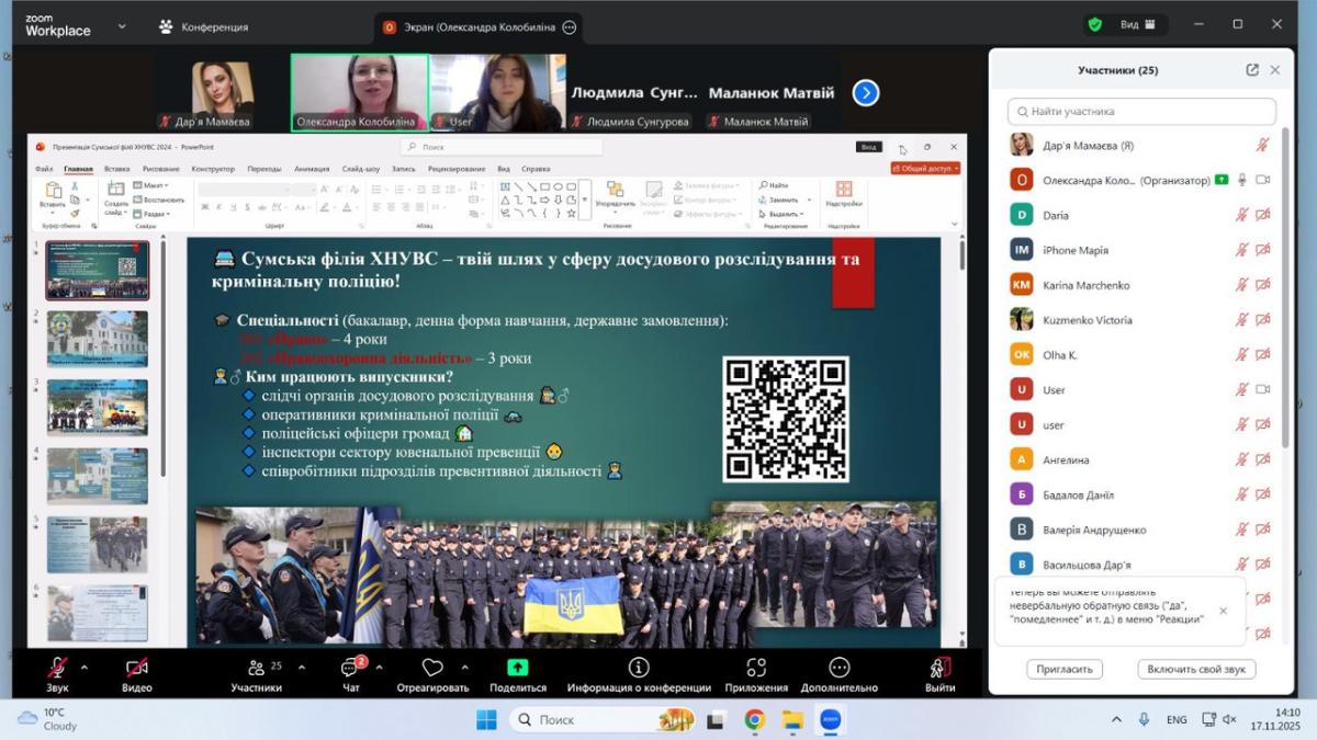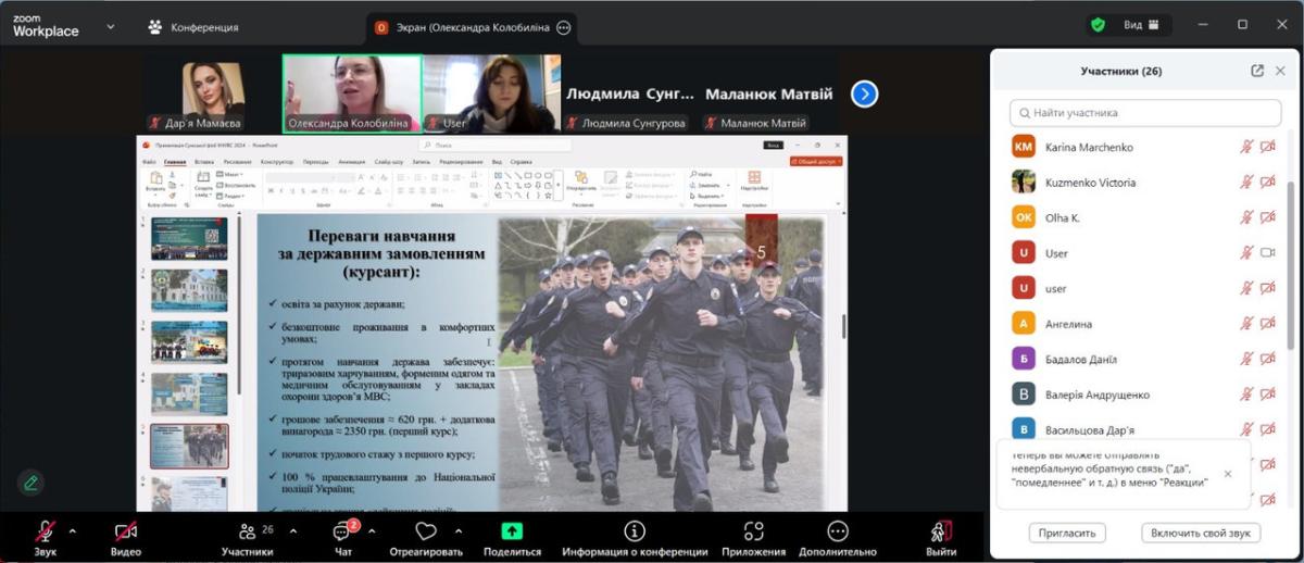 Під час спілкування старшокласники дізналися про можливості здобуття вищої освіти у Сумській філії ХНУВС, зокрема про спеціальності та освітні програми у сфері права й правоохоронної діяльності, особливості навчального процесу та переваги підготовки в університеті. Також обговорили правила вступу, конкурсні вимоги, необхідні для вступу документи, а також широкі можливості подальшого працевлаштування випускників, які реалізують себе у підрозділах Національної поліції, органах державної влади, юридичних службах та інших структурах безпекового та публічного сектору.