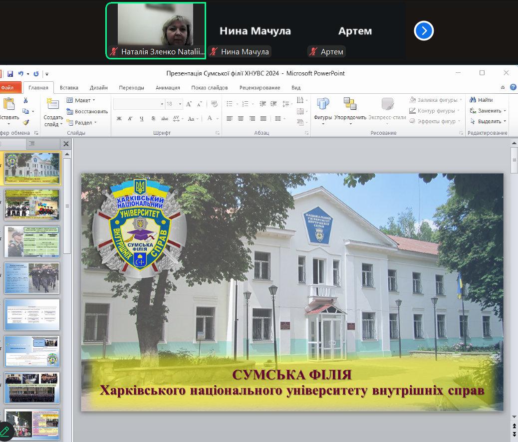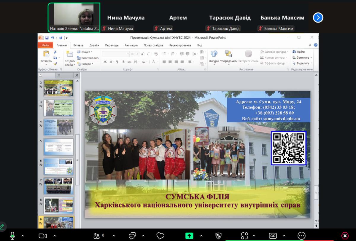 Під час зустрічі Наталія Зленко розповіла про спеціальності, за якими здійснюється підготовка у Сумській філії ХНУВС, особливості освітнього процесу та сучасні підходи до формування компетентностей майбутніх юристів та правоохоронців. Здобувачі дізналися про переваги навчання у філії, можливості практичної підготовки, участі у наукових гуртках, спортивних секціях та волонтерських проєктах.